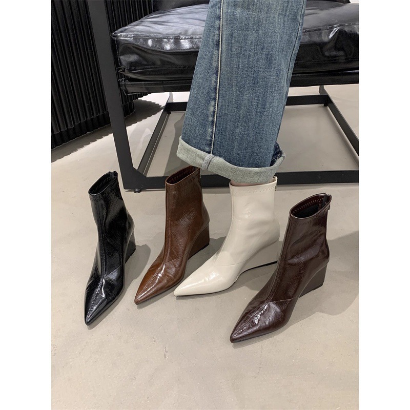 秋冬新款女靴子白色坡跟短靴女尖头坡跟靴高跟女鞋瘦腿坡跟鞋名媛