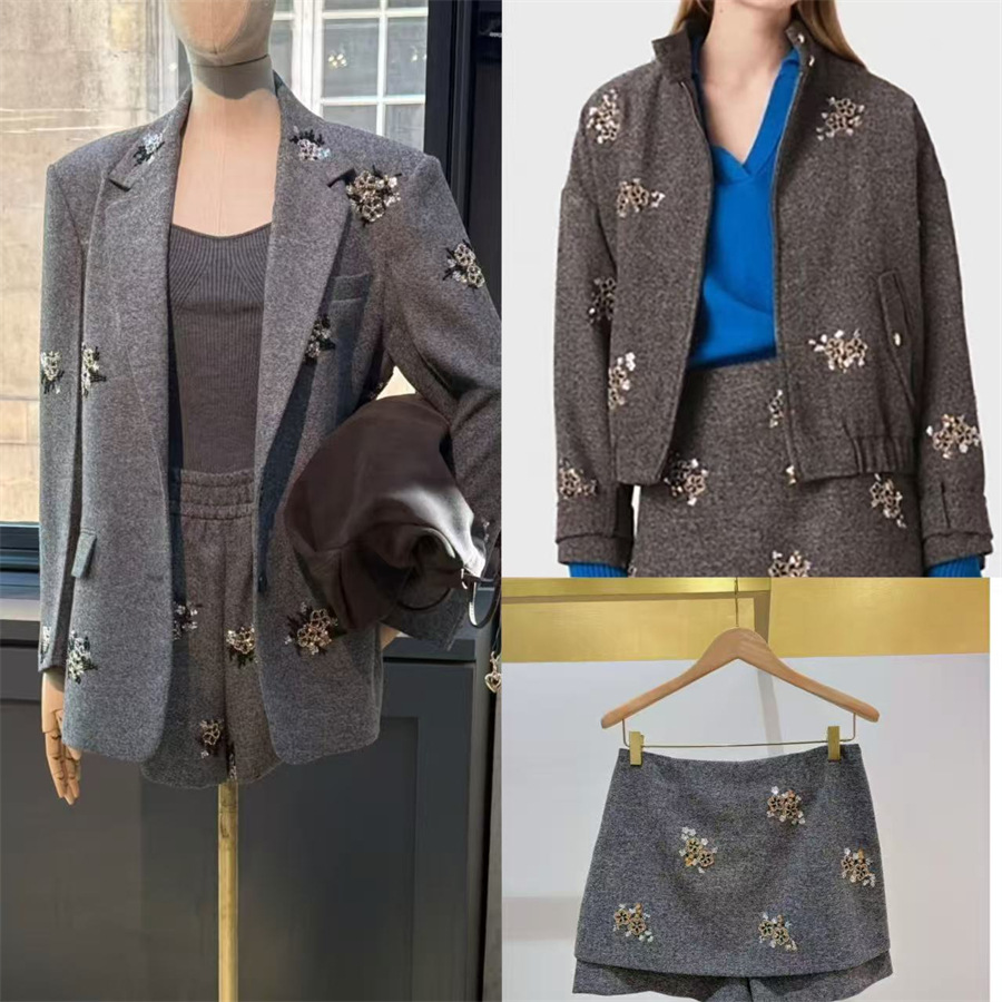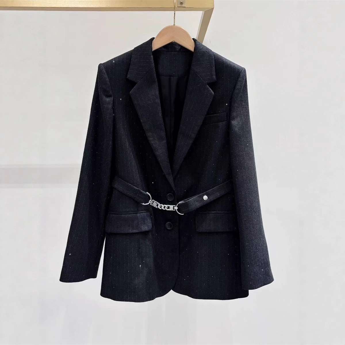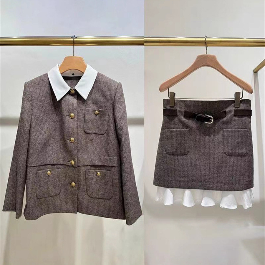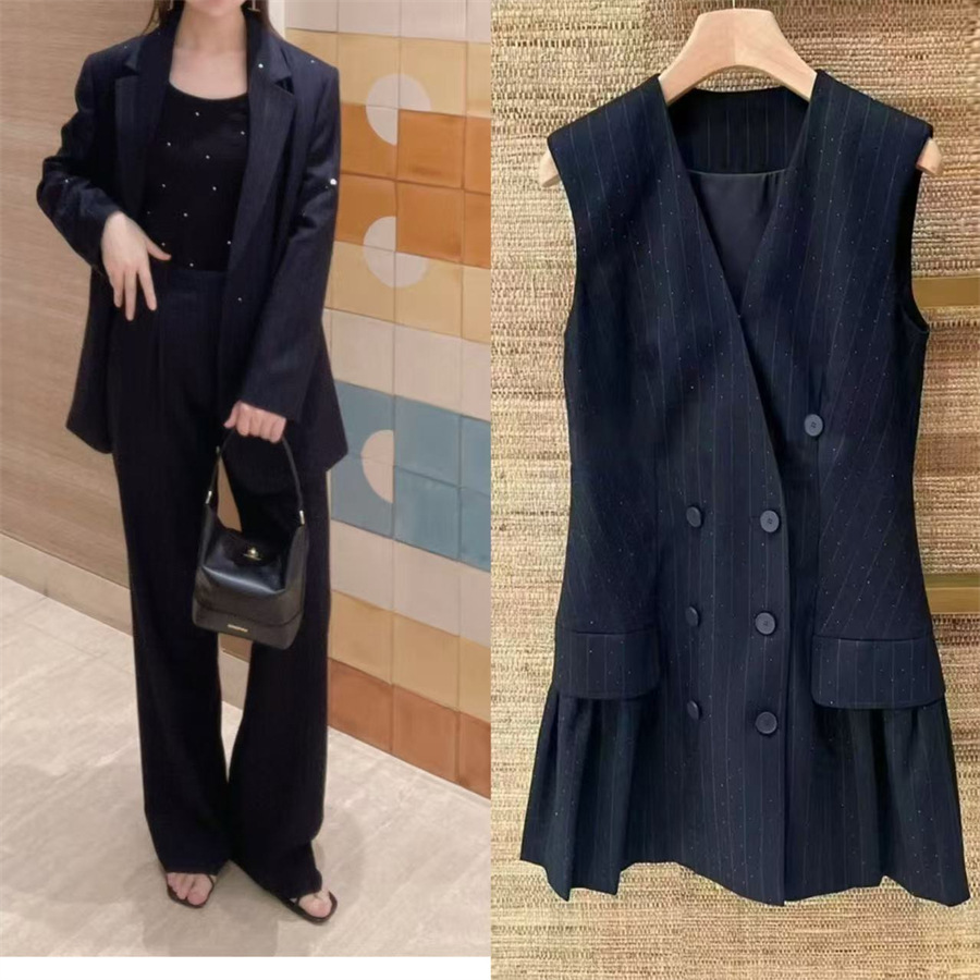 法式小众 2025秋冬竖条纹双排扣西装外套学院风百褶短裙高腰中长款半身裙