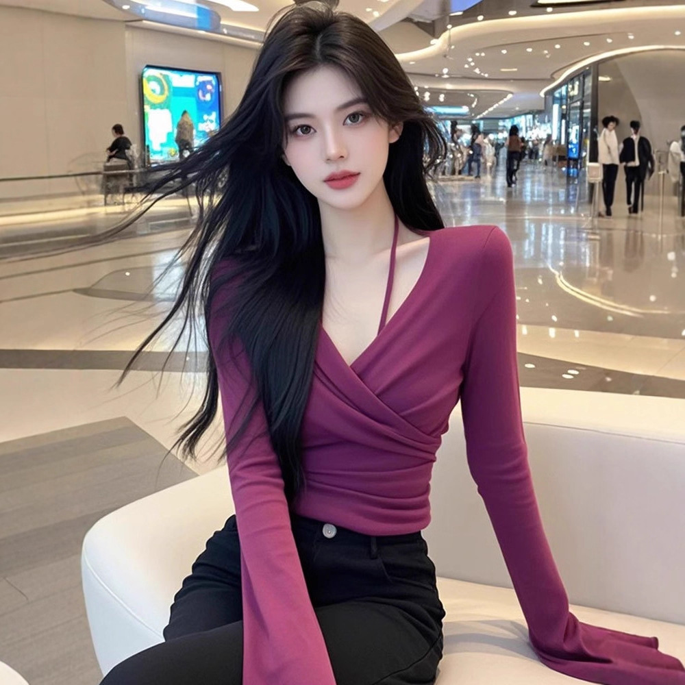 磨毛加厚轻熟风气质百搭德绒紫色短款挂脖上衣2025年秋季新款上衣