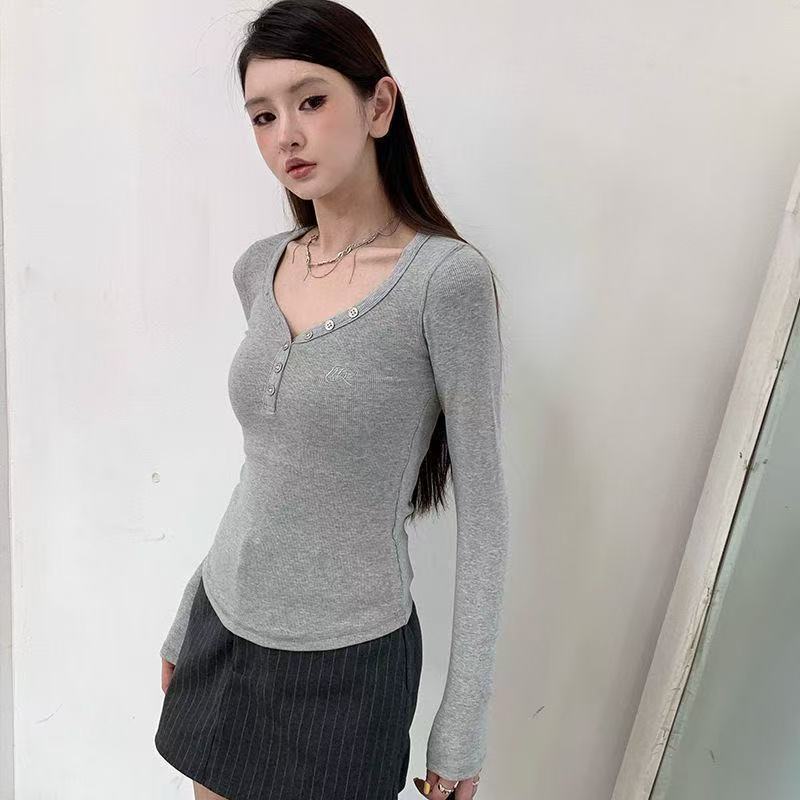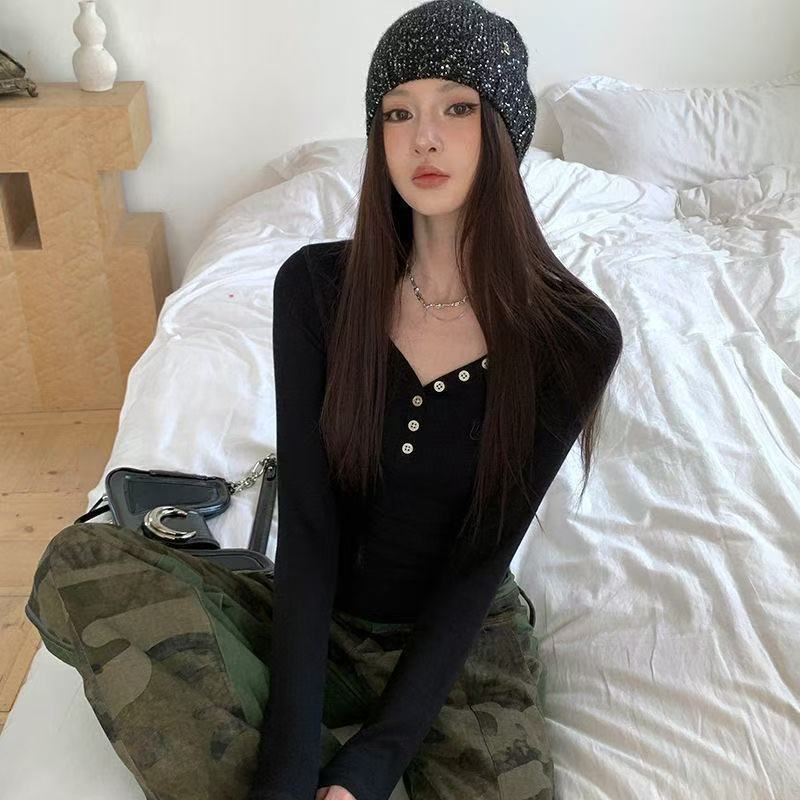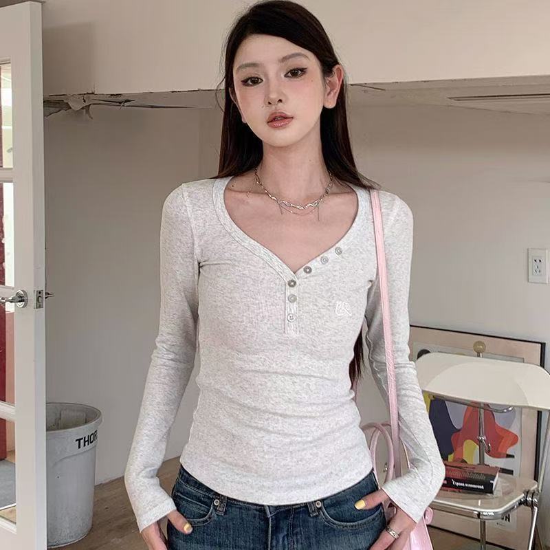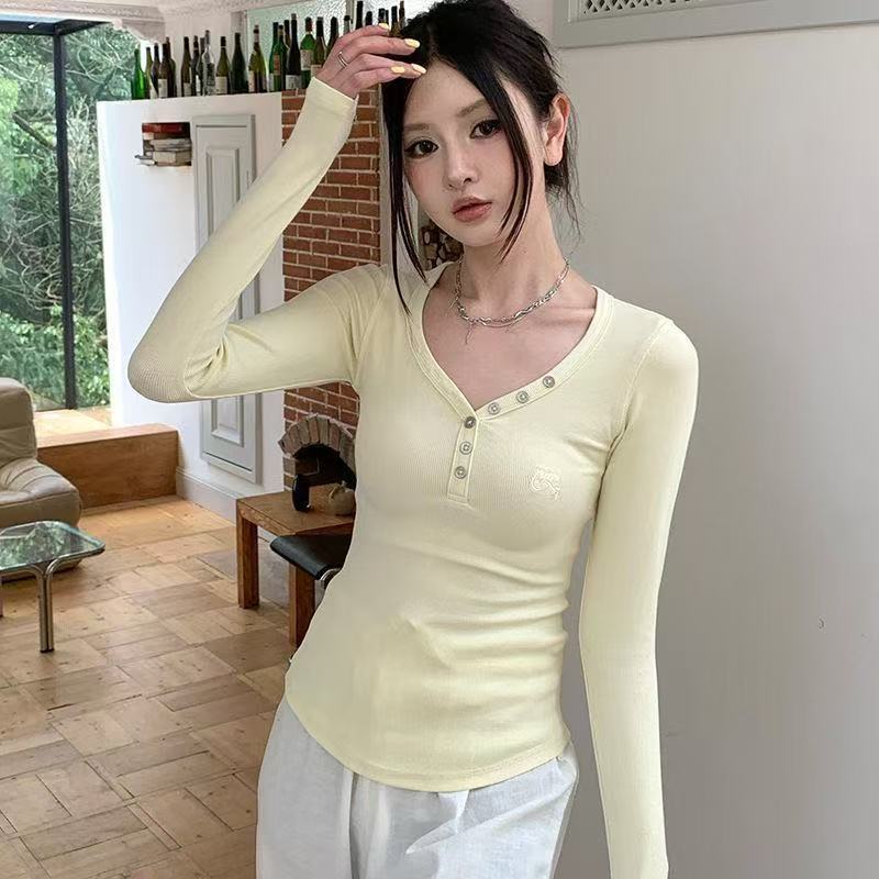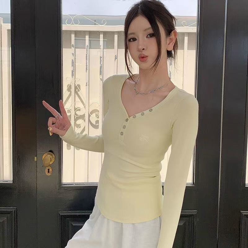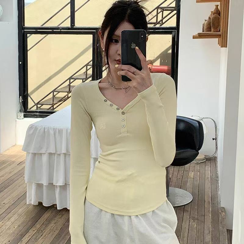 韩版甜辣V领纽扣设计感小众长袖T恤女秋季正肩修身显瘦打底衫上衣