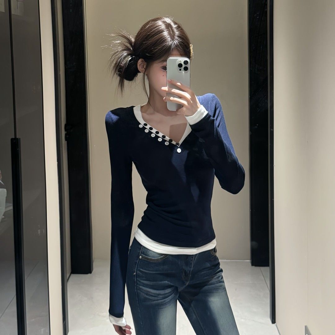 秋冬德绒V领排扣新款拼接假两件长袖t恤打底衫女修身显瘦内搭上衣