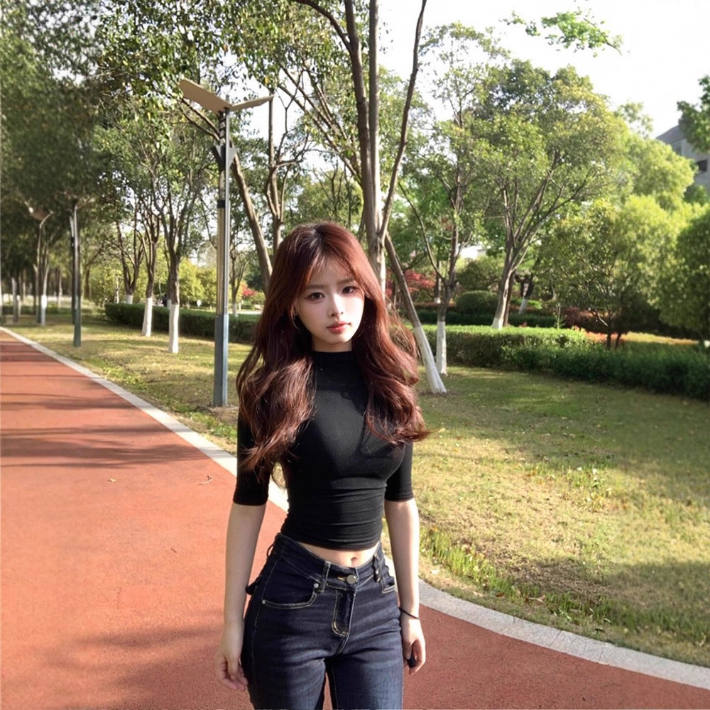 纯欲气质半高领正肩中袖t恤女夏季修身黑色紧身辣妹短款显瘦上衣