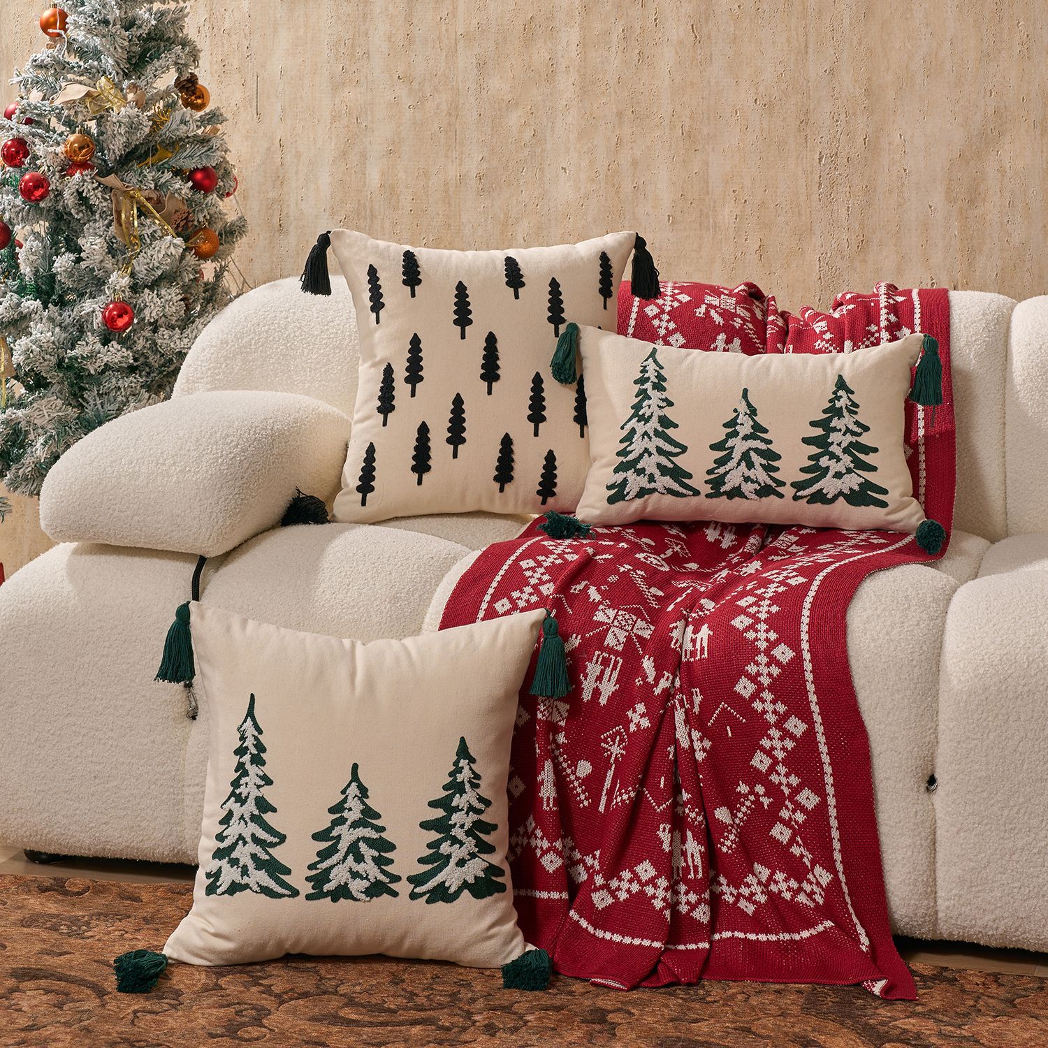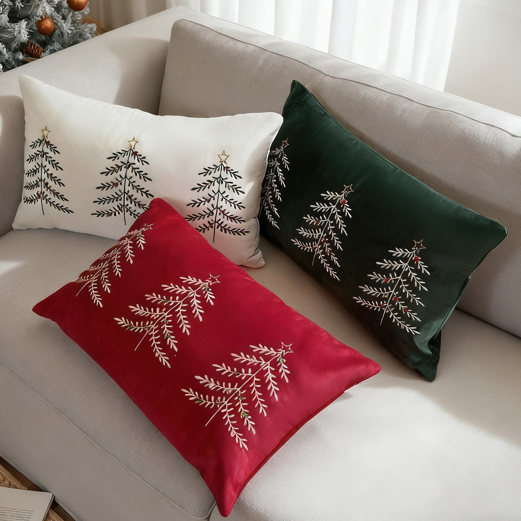跨境新款三颗圣诞树刺绣抱枕套节日装饰靠枕套客厅沙发靠垫套