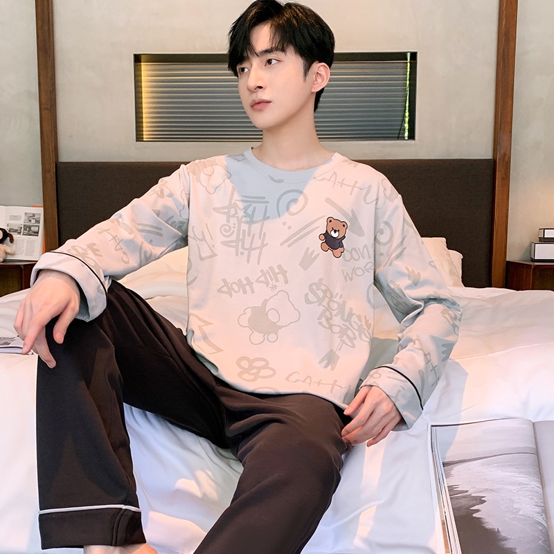 青少年睡衣男优质仿棉长袖长裤男士休闲款宽松大码外穿家居服套装