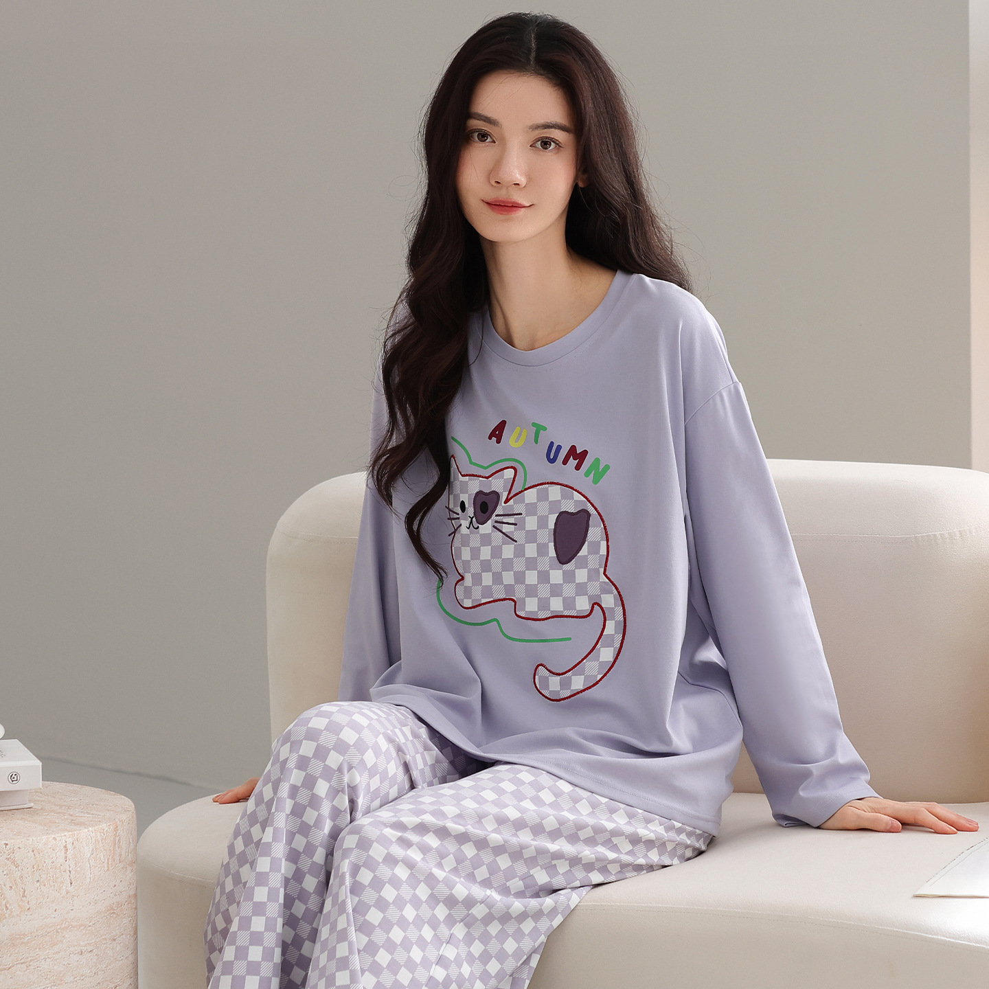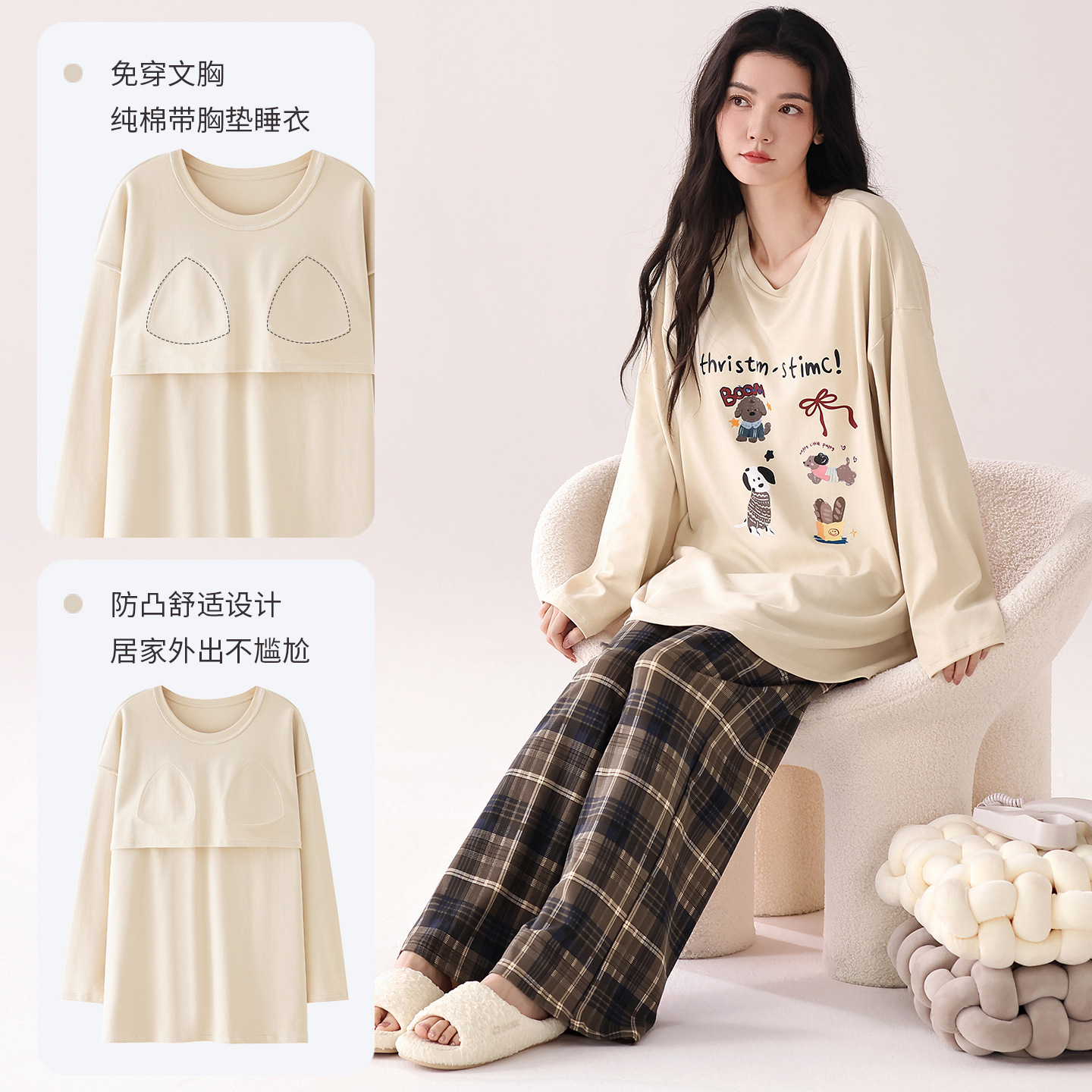 2025秋季新品100%纯棉女士睡衣套装带胸垫甜美印花舒适可外家居服