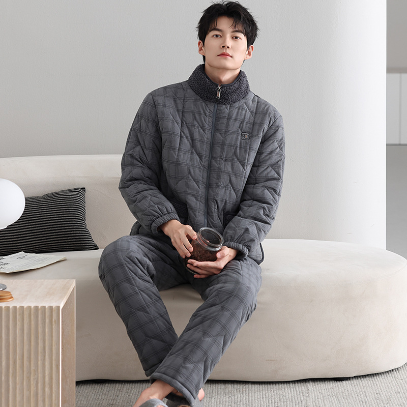 2025冬季睡衣男士三层加厚加绒羽绒夹棉蓄热保暖家居服不臃肿套装