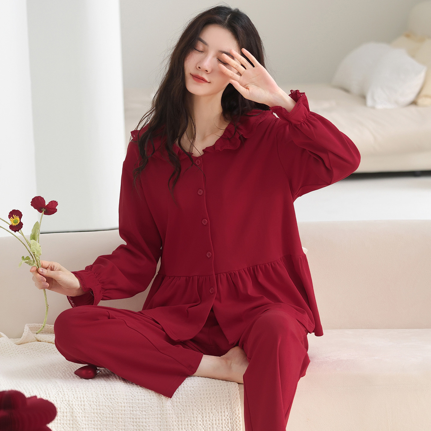 秋冬季红色本命年睡衣纯棉长袖开衫女士新婚舒适透气棉家居服套装