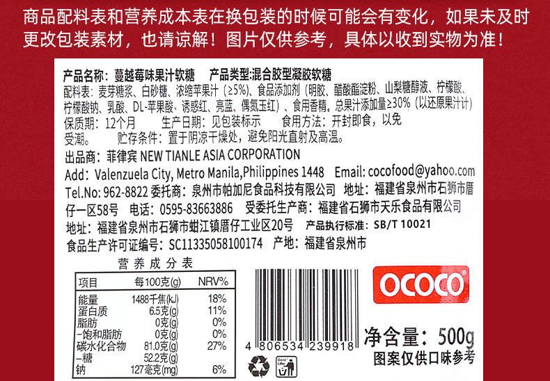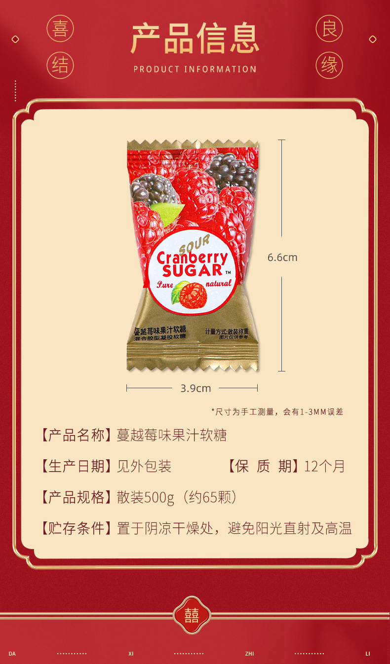 包装规格 蔓越莓味软糖500g(约65颗),综合口味软糖500g