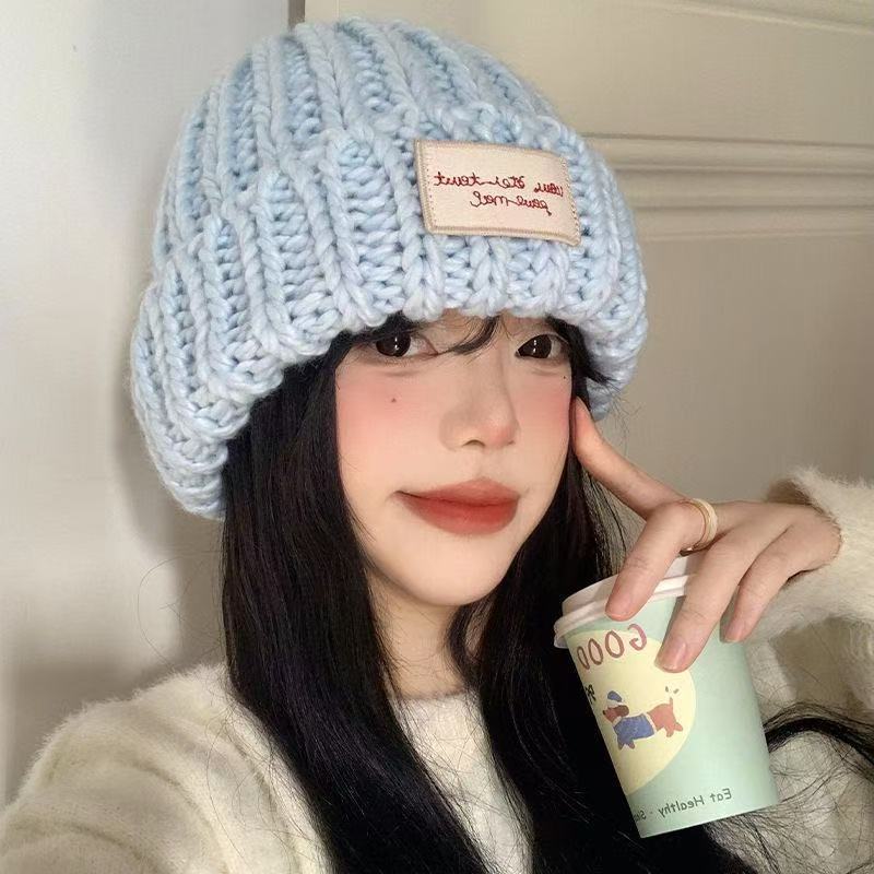 秋冬の新型保温太い毛糸の大きい頭の周りのニット帽の女性の顔を見せます。