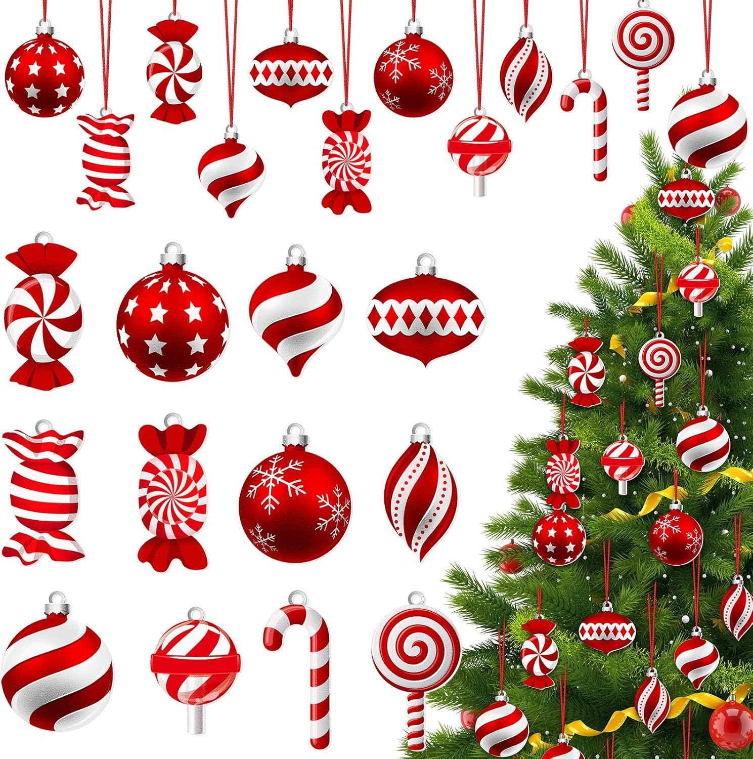 24件木质圣诞树装饰品圣诞彩色球薄荷糖果姜饼雪花树装饰粉红色