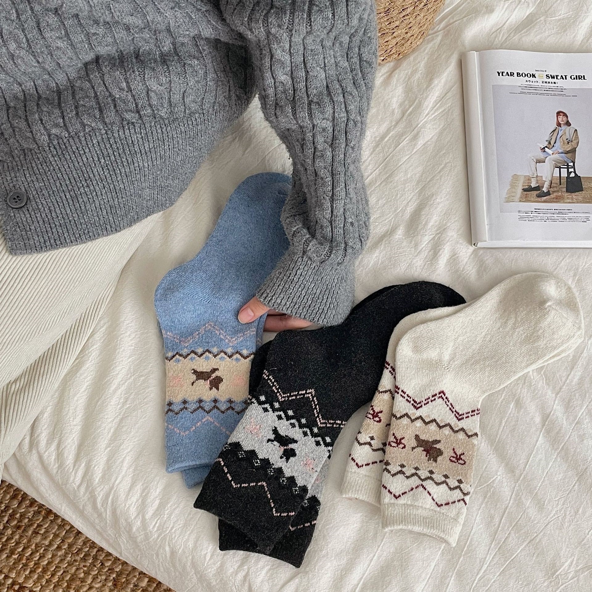 袜子女秋冬新品韩系简约拼色堆堆袜时尚ins费尔岛小狗保暖堆堆袜