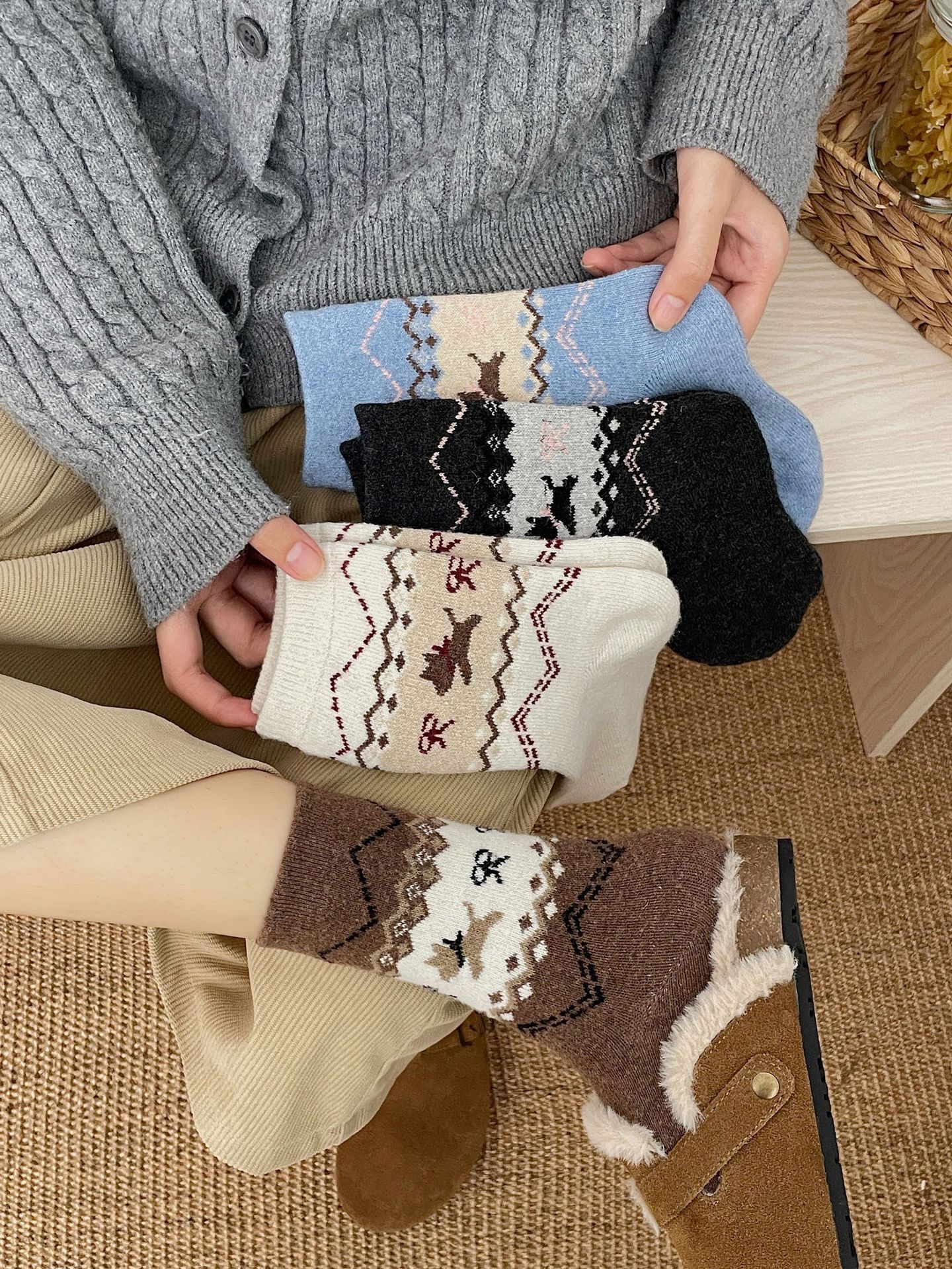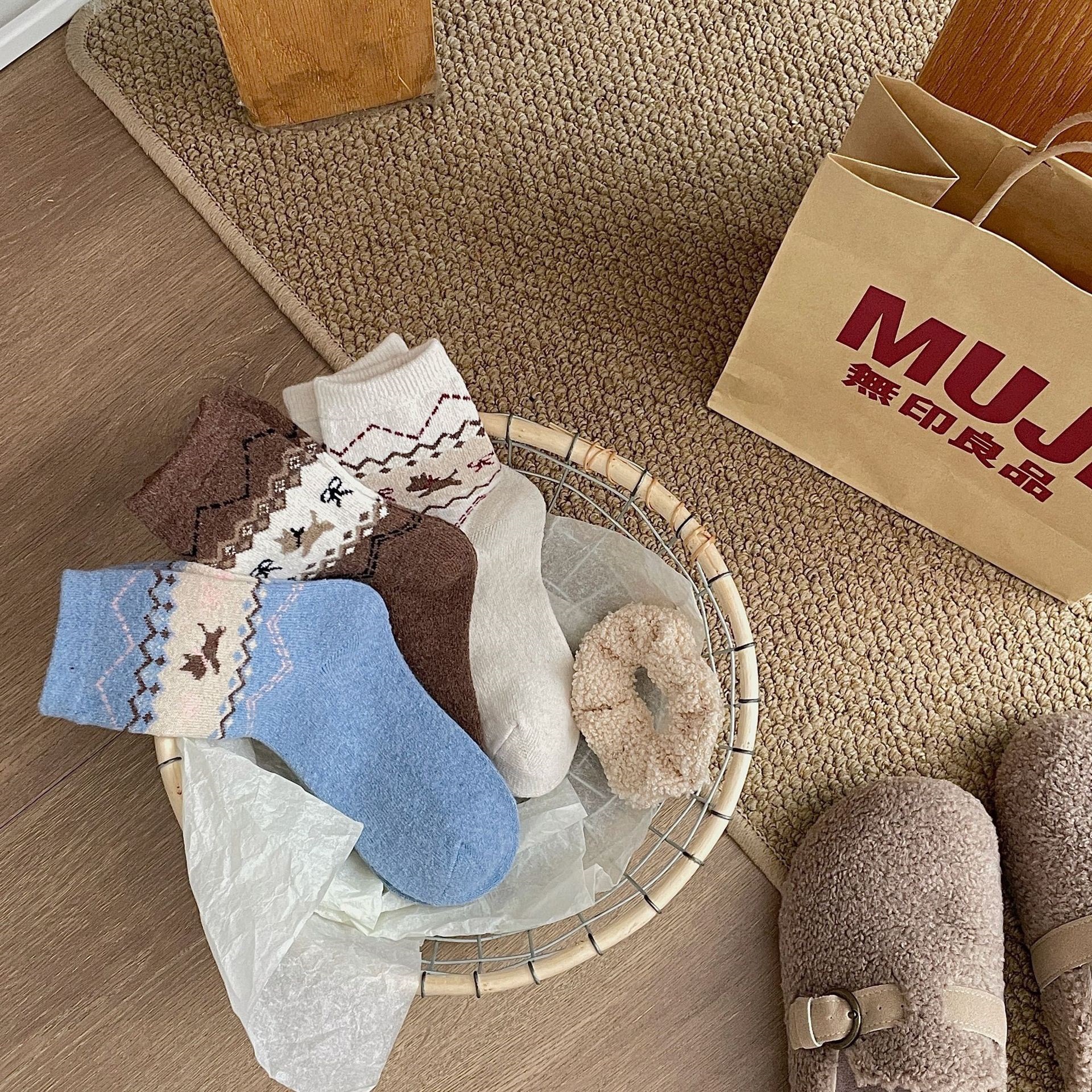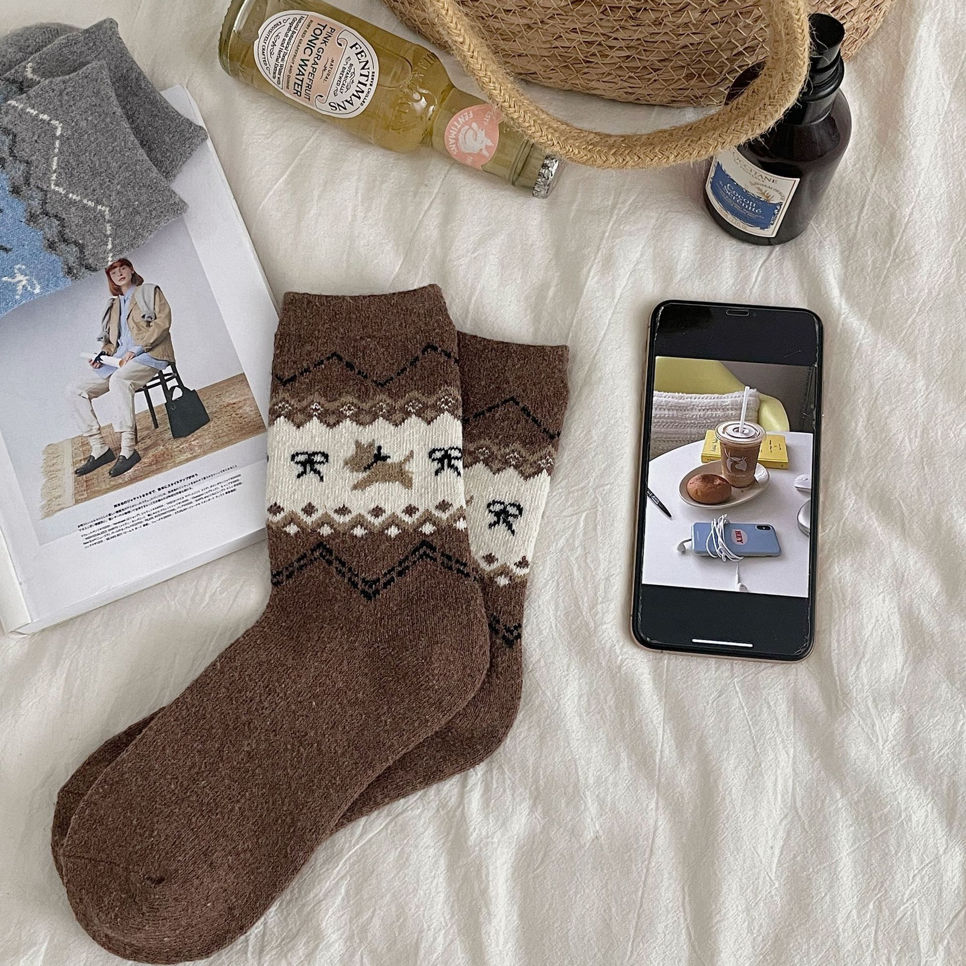 袜子女秋冬保暖中筒袜ins复古民族风长筒袜美拉德休闲百搭堆堆袜