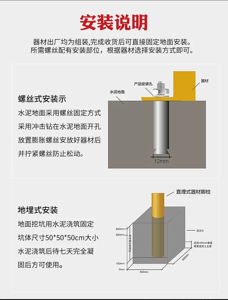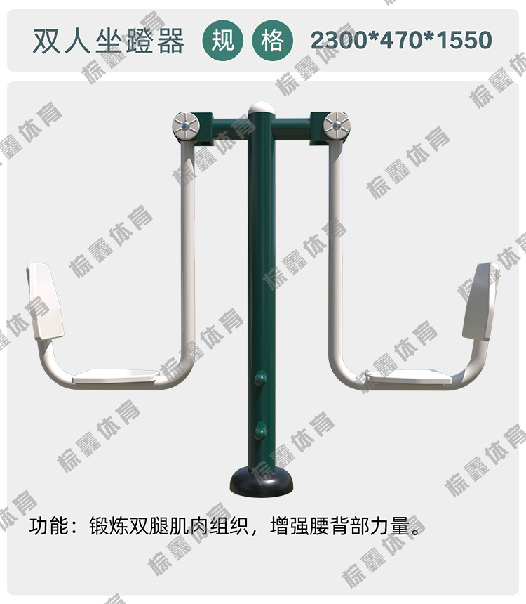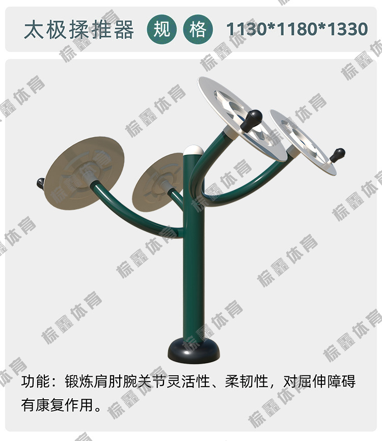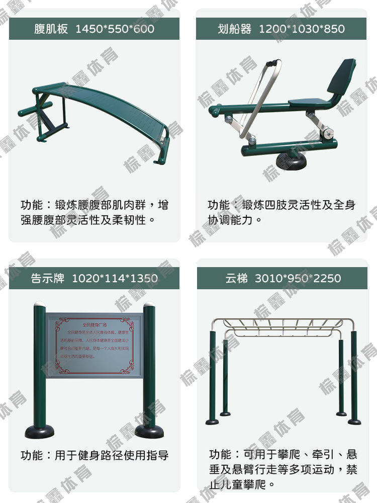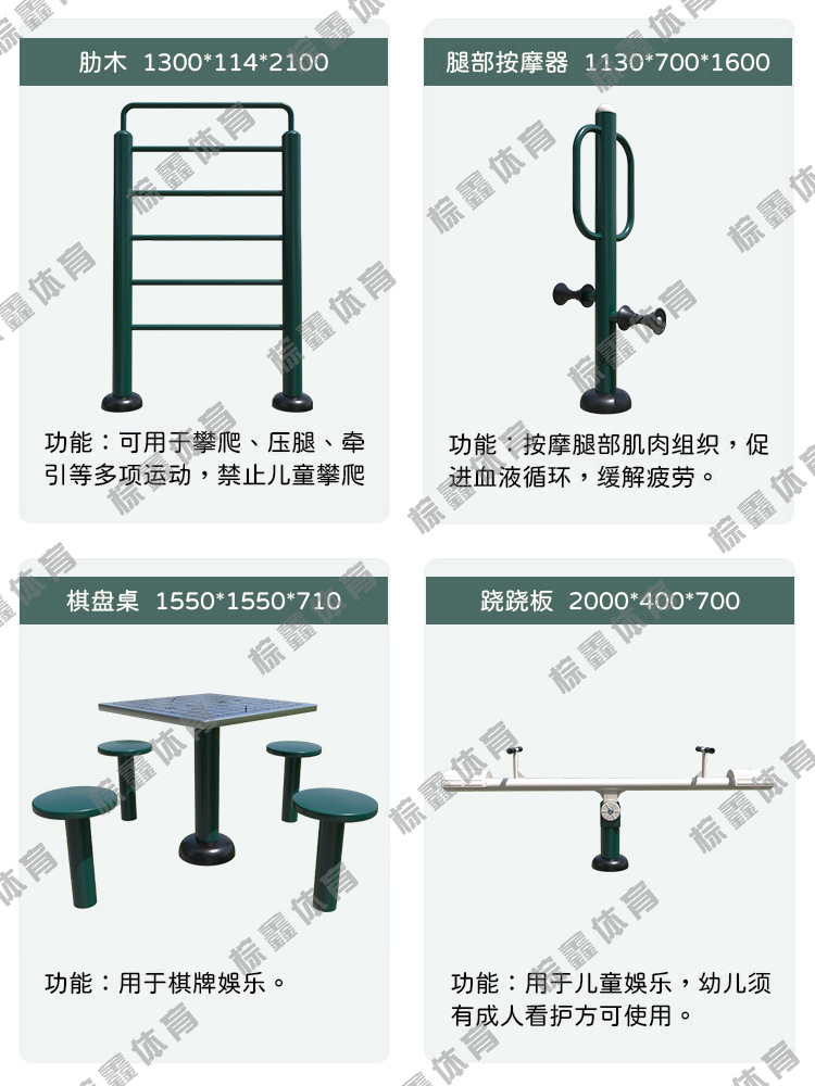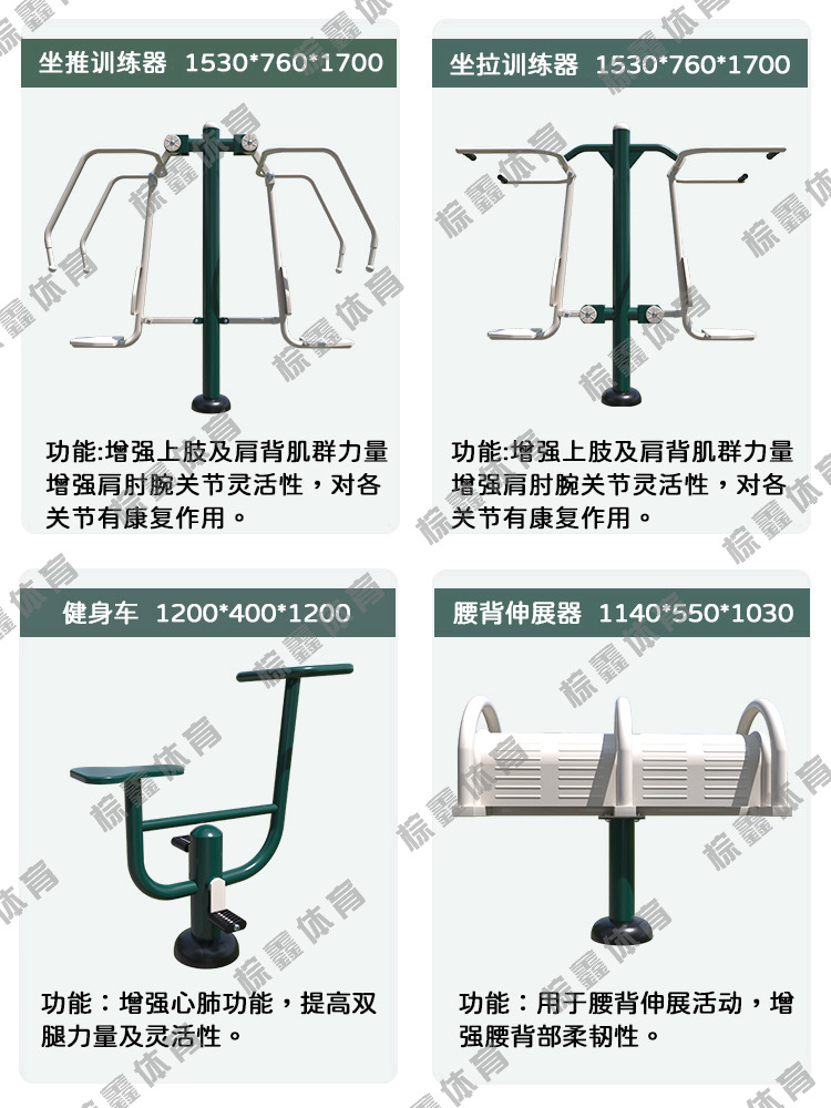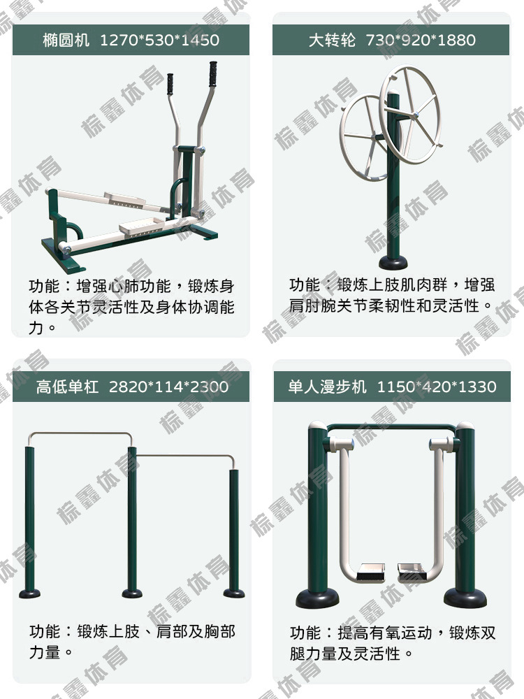 规格 大转轮,腹肌板,划船器,单人漫步机,告示牌,健骑机,健身车,腰背按摩,跑步机,双人漫步机,椭圆机,平步机,跷跷板,三人扭腰,上肢牵引,双人浪板,单杠,肋木架,双杠,高低杠,云梯,双人秋千架,双人坐蹬,双人坐拉,双人坐推,太极揉推,腿部按摩器,棋盘桌,伸背架,坐立扭腰,114器材地罩(5个)