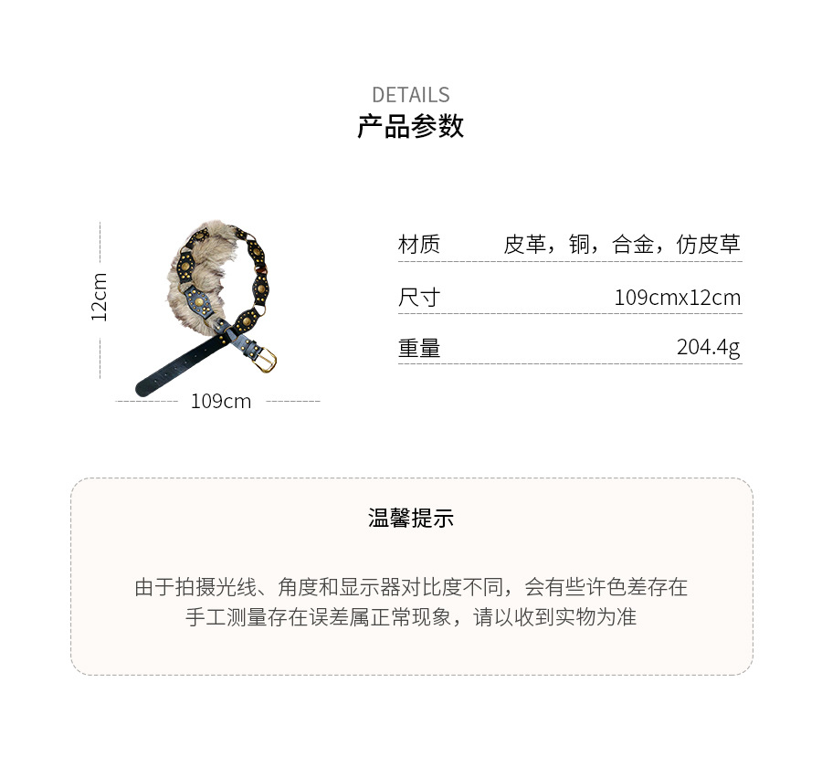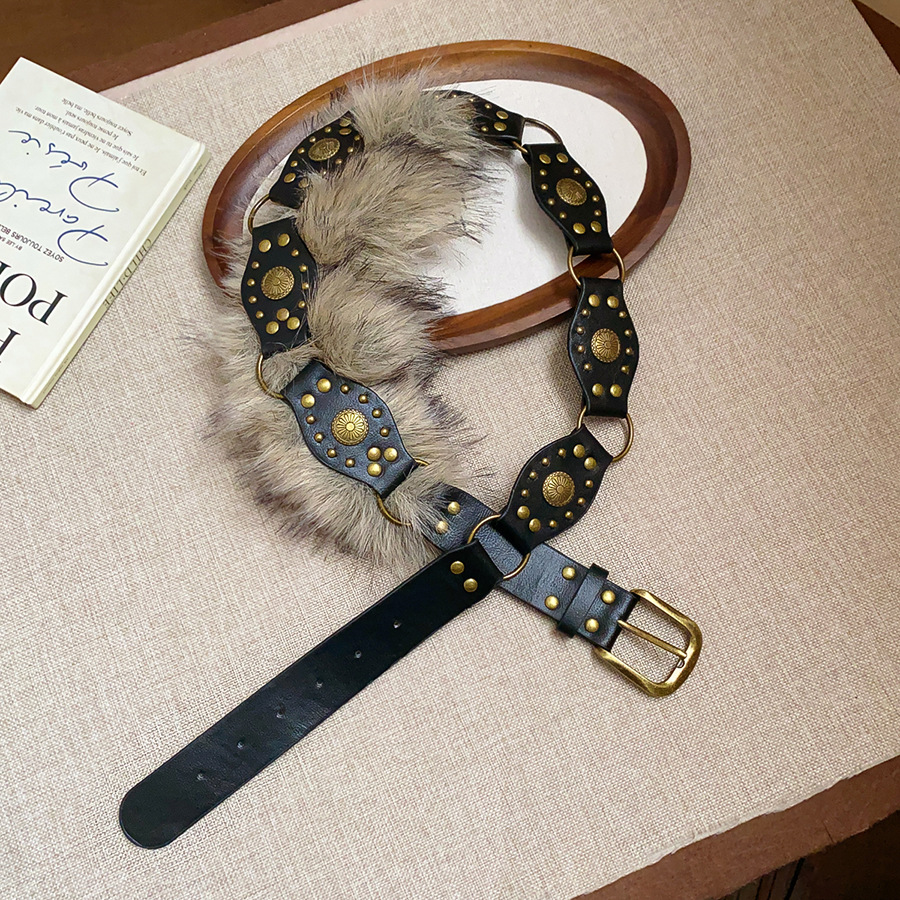 欧美皮革毛毛镶钻腰带秋冬复古小众设计感腰链轻奢高级感腰饰饰品