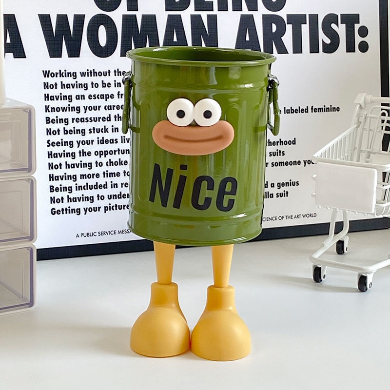 黄色の足と大きな口のステッカー収納小さな鉄バケツデスクトップ鉄ペンホルダー装飾装飾品フラワーバケツアクセサリー三次元クリエイティブ