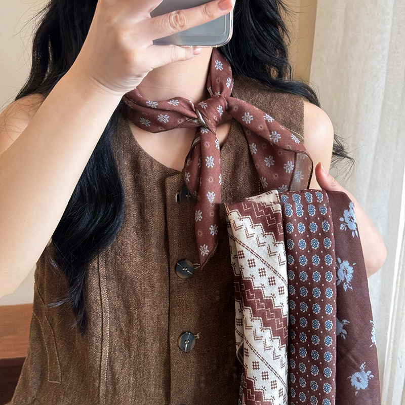 新款气质高级感系脖棉麻丝巾女士韩系慵懒风百搭棕色系列小方巾