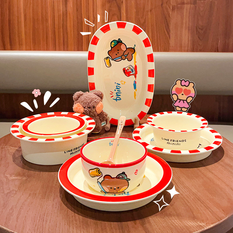 minini布朗熊饭碗陶瓷餐具套装家用新款可爱儿童汤碗盘子大容量