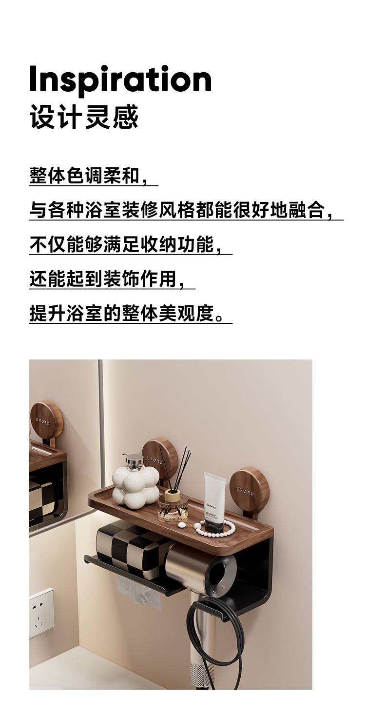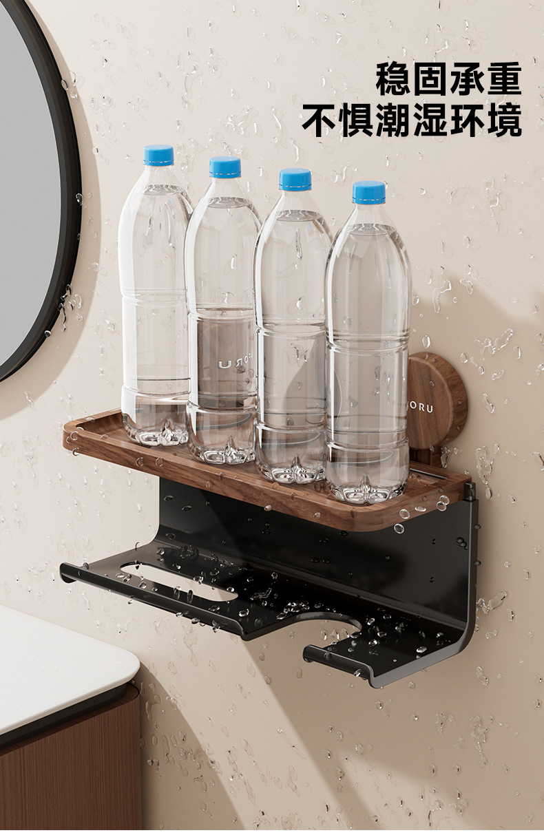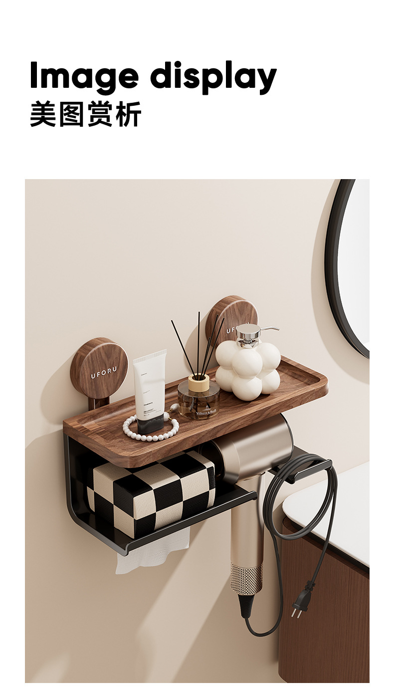 黒クルミ材 穴あけ不要 防水 ティッシュボックス 浴室収納ラック