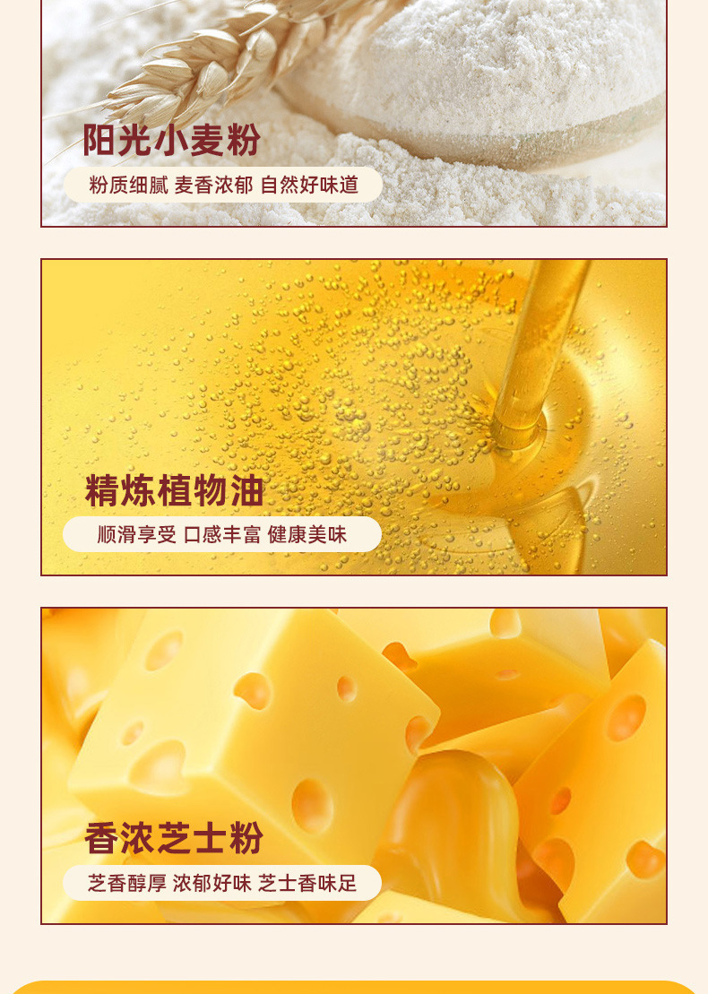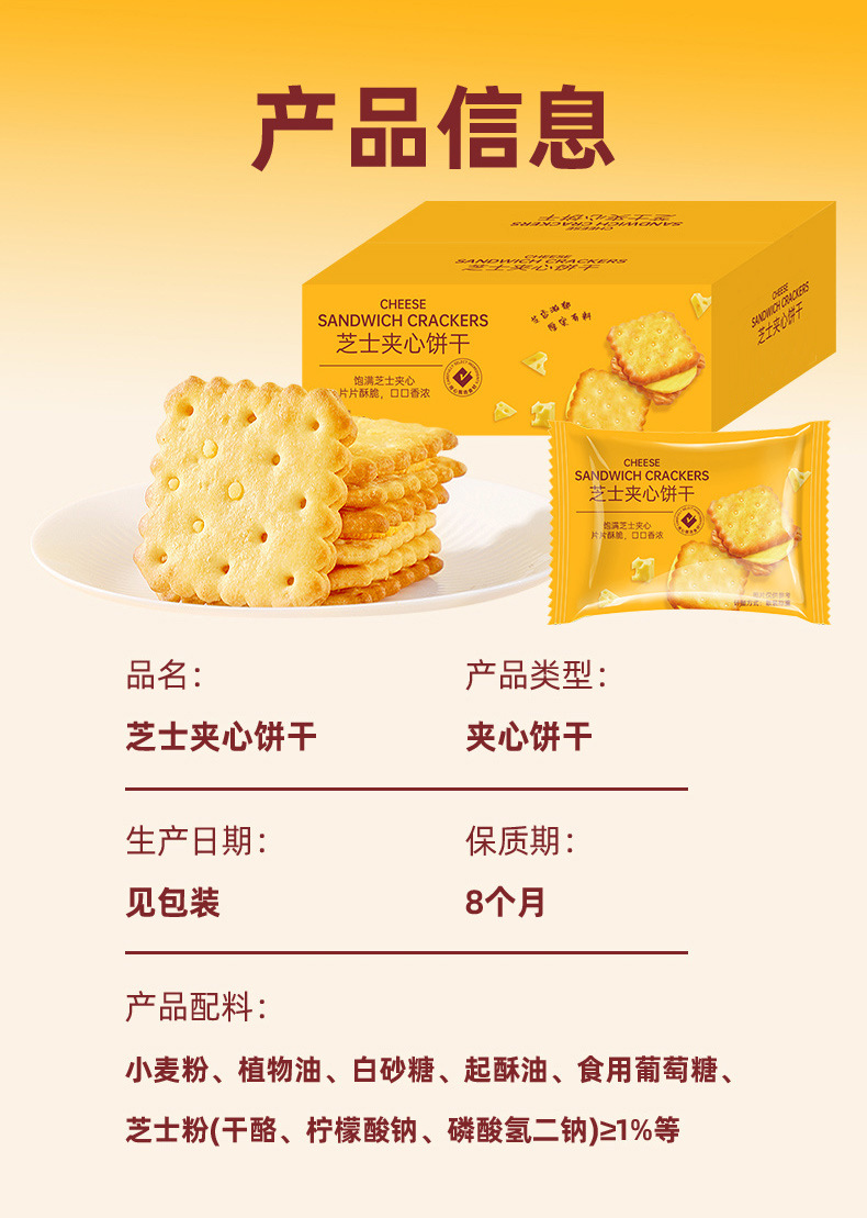 包装规格 300g/1箱(专用彩箱)芝士夹心饼干,300g/2箱(专用彩箱)芝士夹心饼干,300g/3箱(专用彩箱)芝士夹心饼干,300g/4箱(专用彩箱)芝士夹心饼干,海盐+芝士+黑松露各1芝士夹心饼干,海盐1箱+芝士1箱芝士夹心饼干,黑松露1箱+芝士1箱芝士夹心饼干