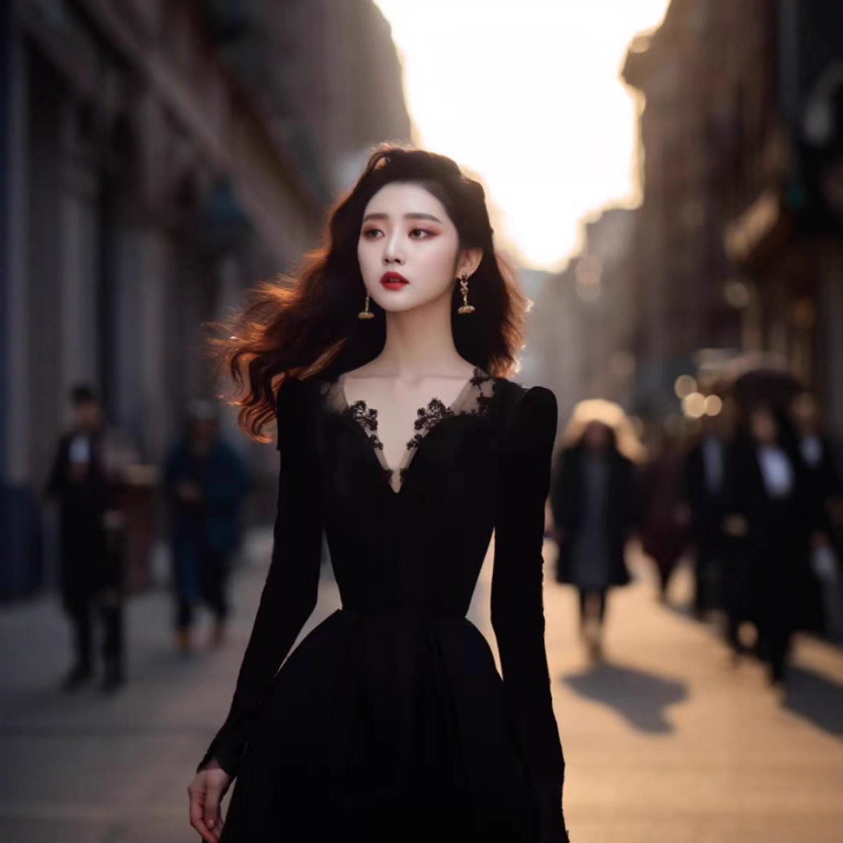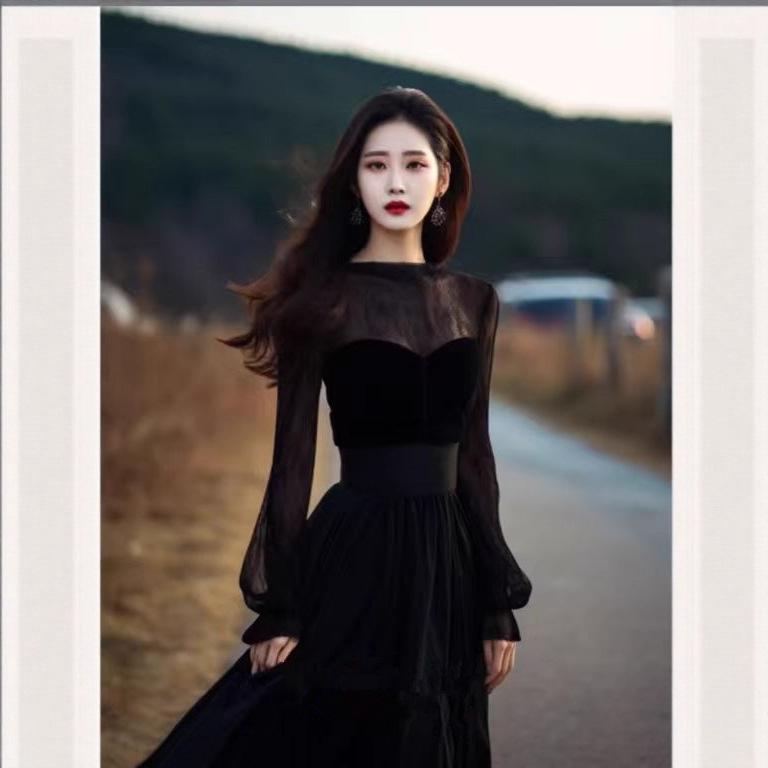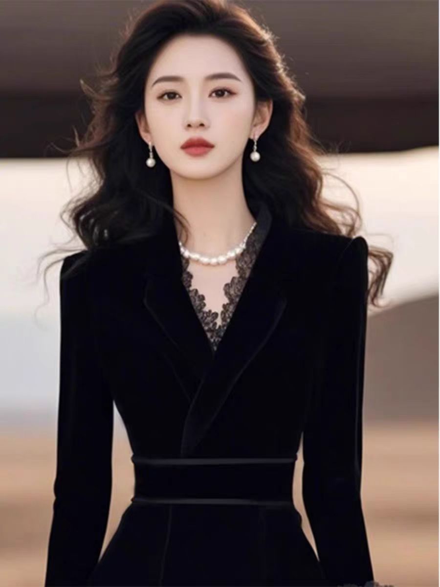 上流社会气质名媛轻奢礼服高级感赫本风黑色蕾丝拼接丝绒连衣裙冬