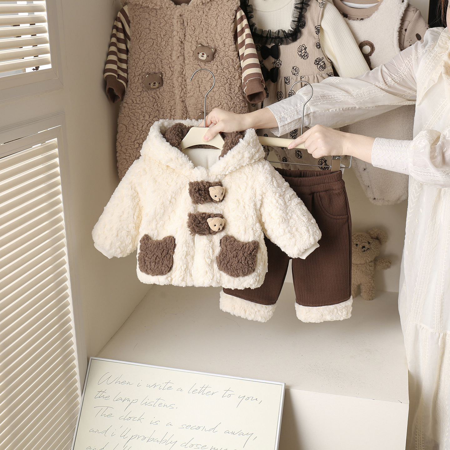 冬款宝宝加绒连帽毛毛上衣裤子套装婴儿加厚外出服两件套冬天衣服