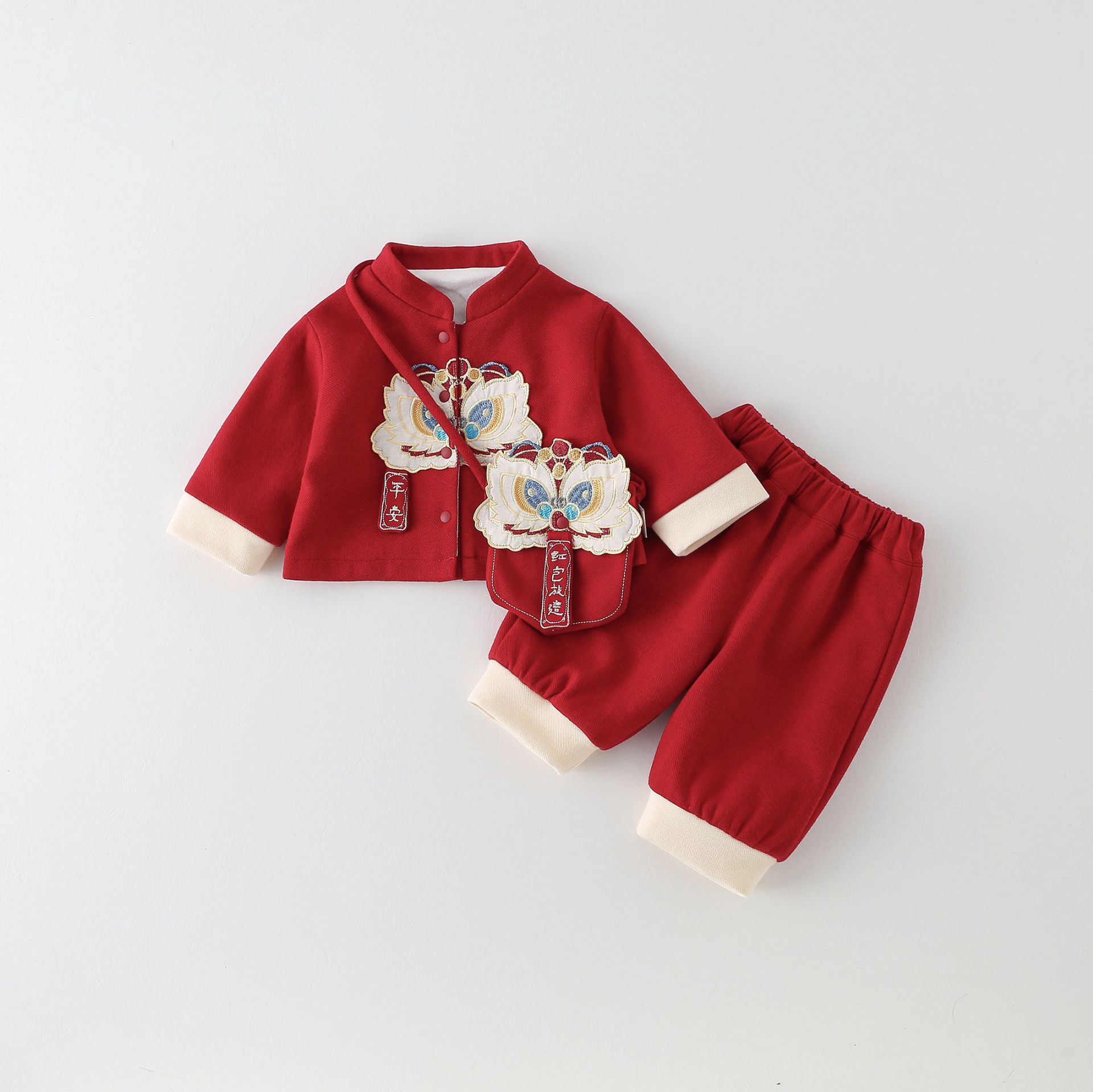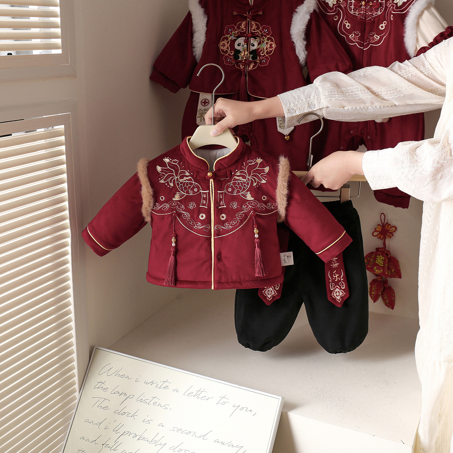 冬季款儿童加绒满月上衣裤子冬天宝宝保暖生日套装婴儿国风衣服