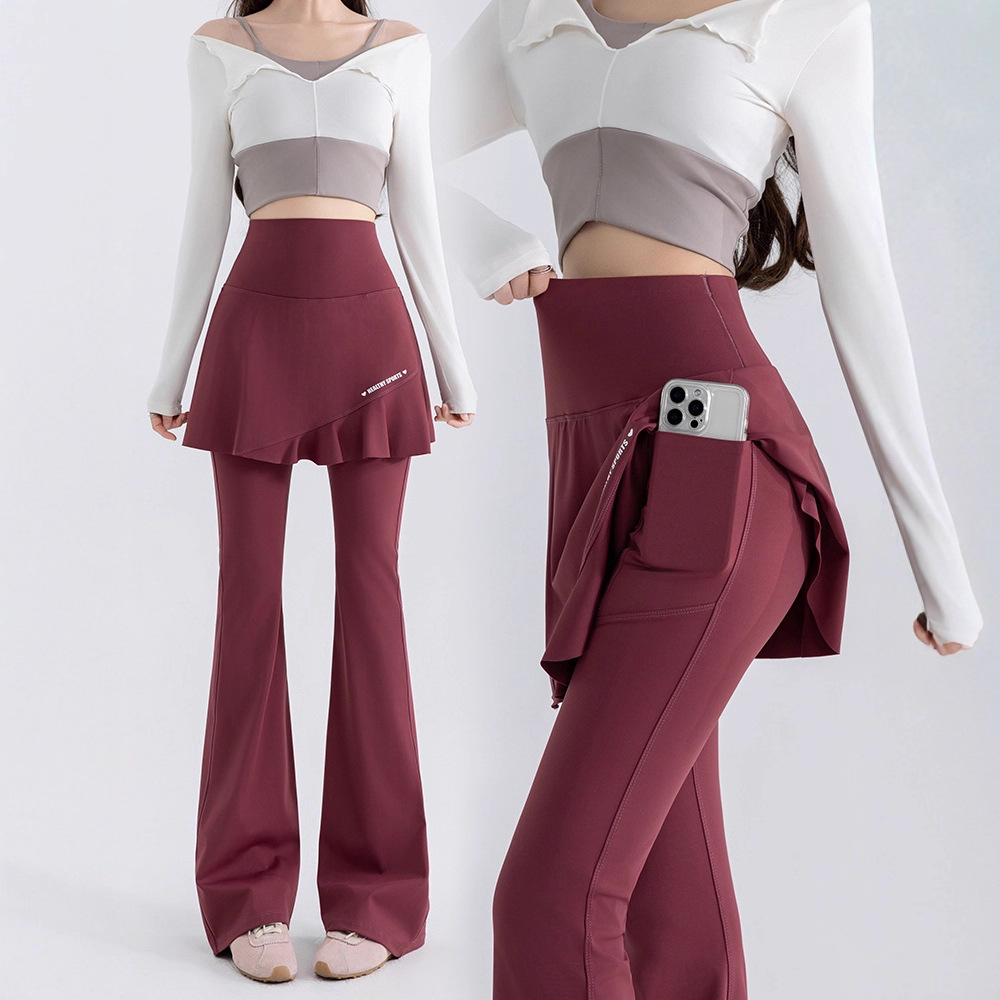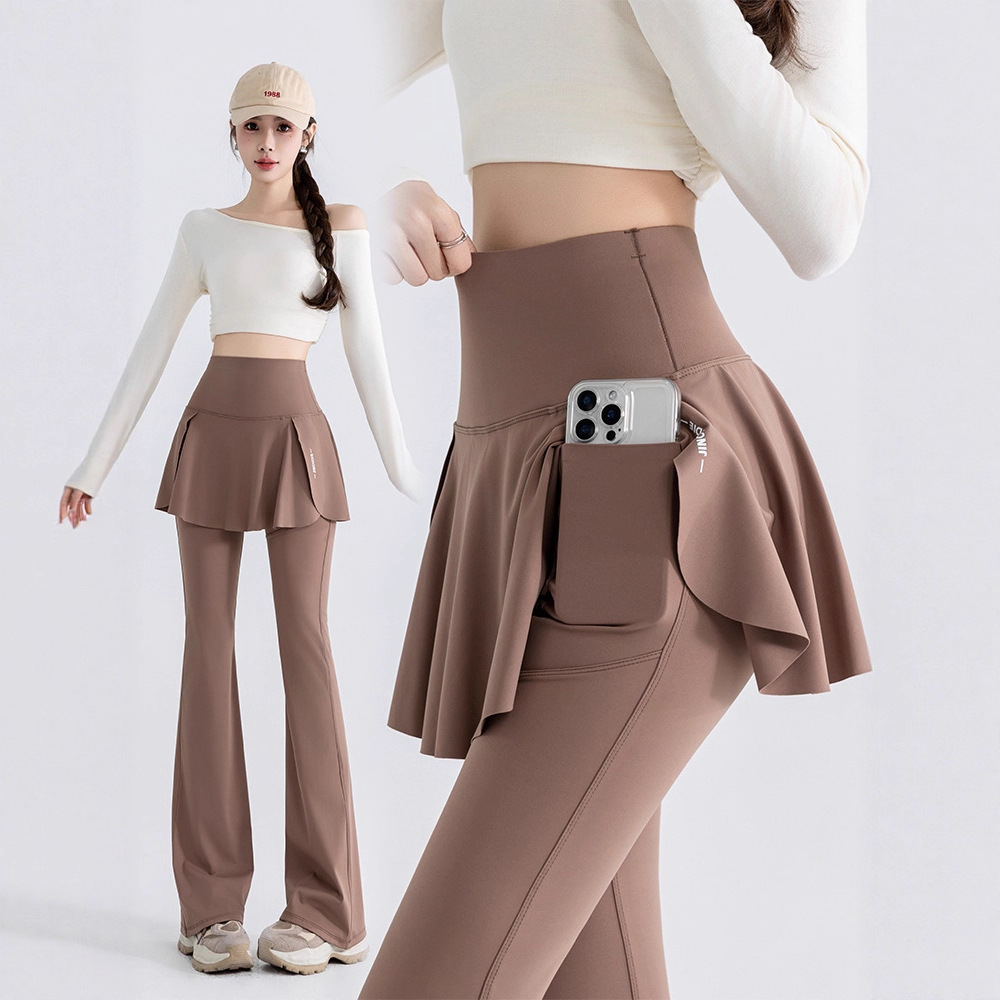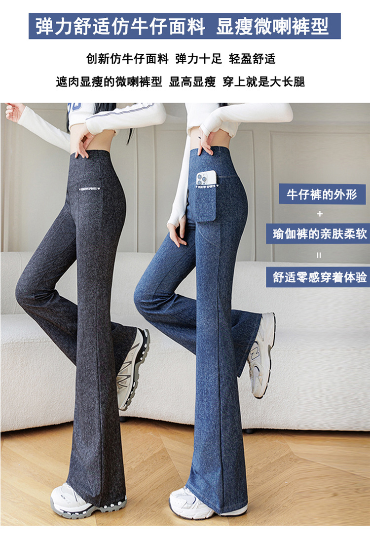 秋冬新款假两件微喇瑜伽裤高腰收腹侧口袋鲨鱼裤女大码显瘦打底裤
