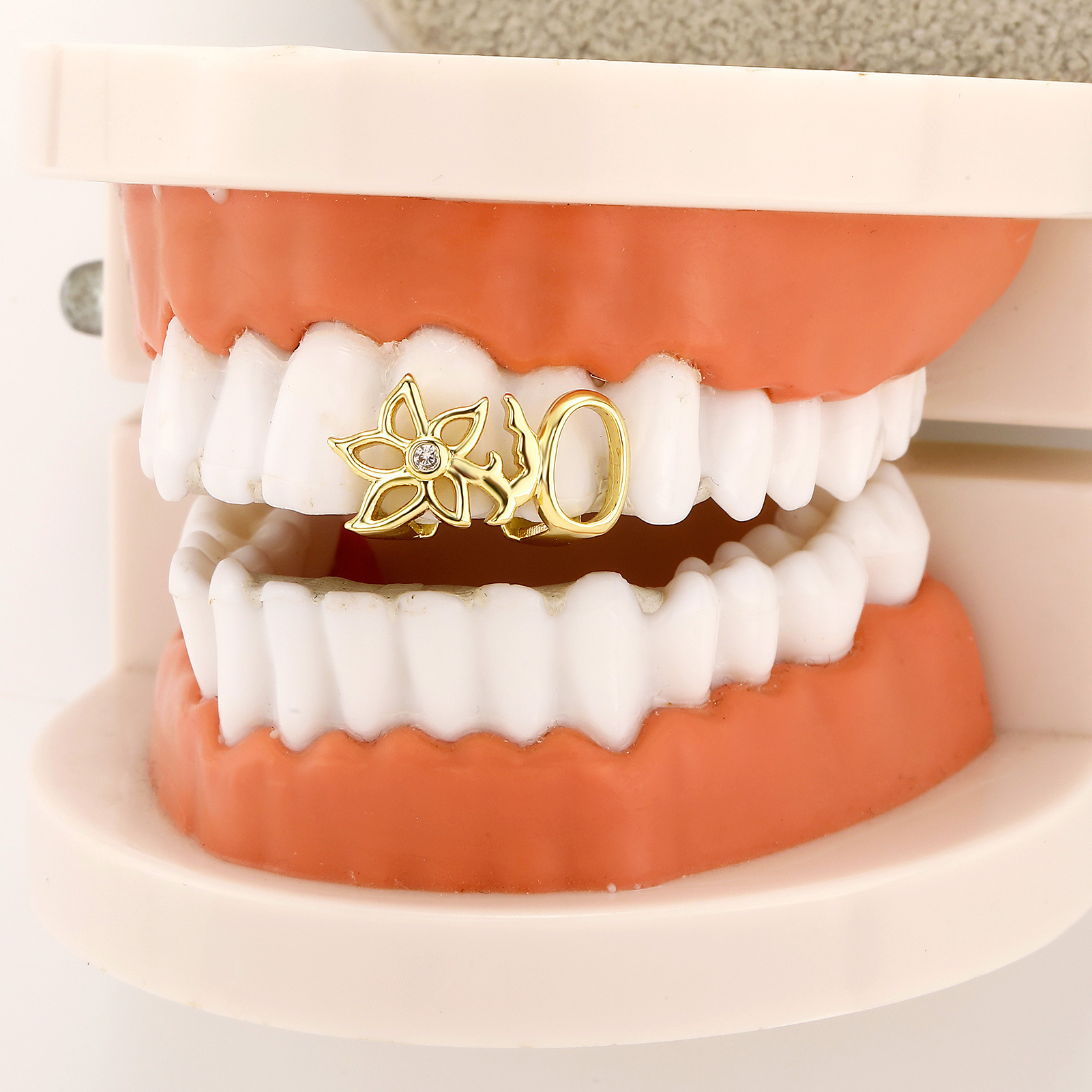 3、 将金牙(银牙)放入嘴里,用上下牙轻轻咬合金牙。软掉的硅胶受到牙齿的挤压在使用者口腔中调整型状,与齿形匹配,起到固定定型的作用。
