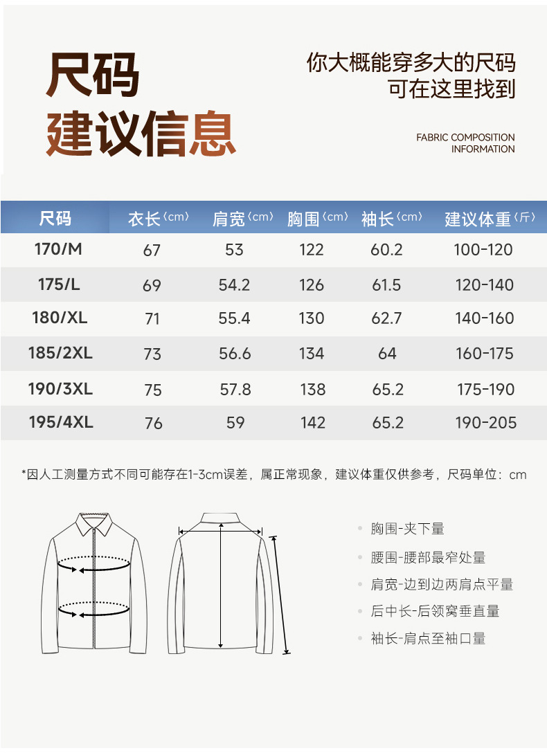 48/170/M 适合90-120斤,50/175/L 适合120-135斤,52/180/XL适合135-150斤,54/185/XXL 适合150-165斤,56/190/XXXL适合165-180斤,58/195/4XL适合180-200斤