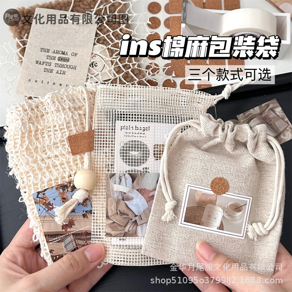 ins风高颜值棉麻束口袋网格小卡打包礼品袋博主同款平价diy装饰袋