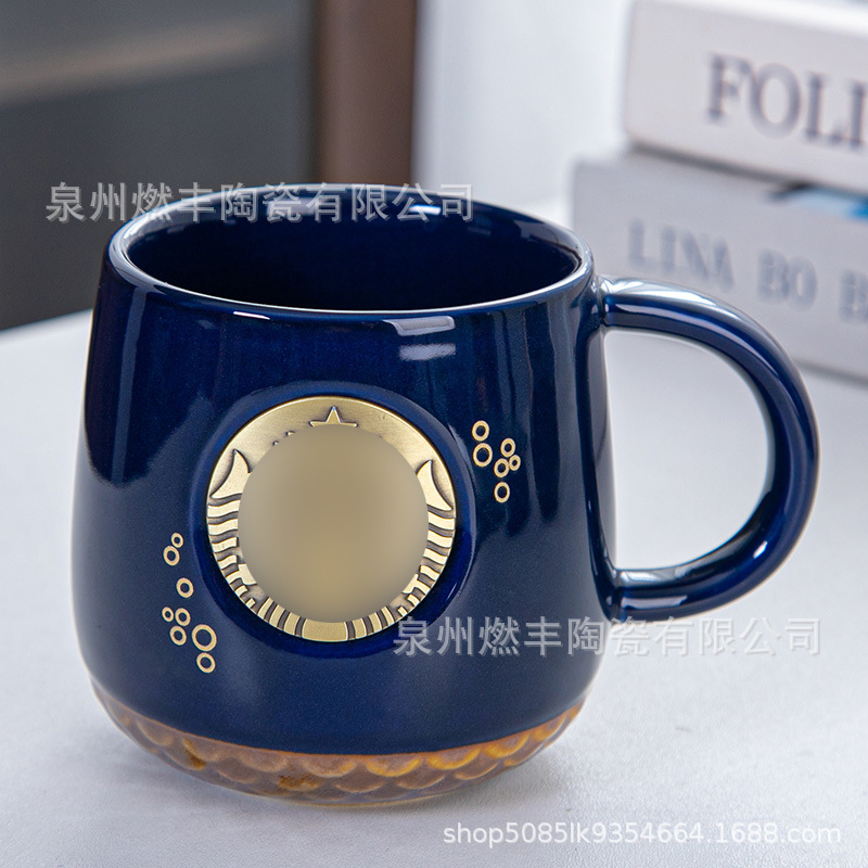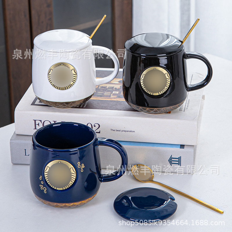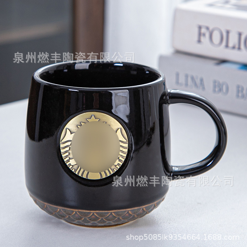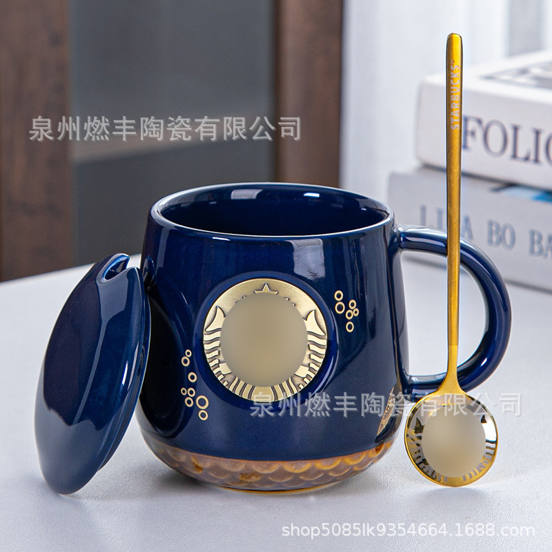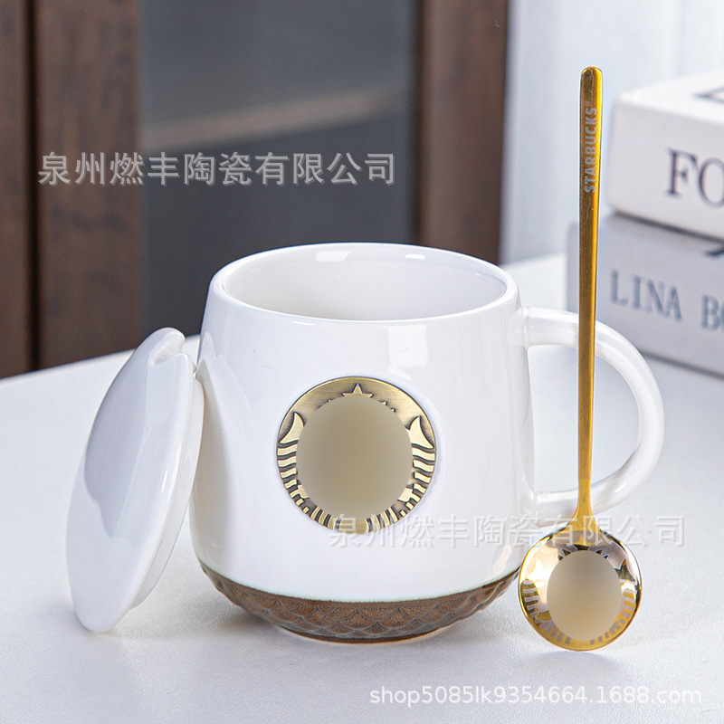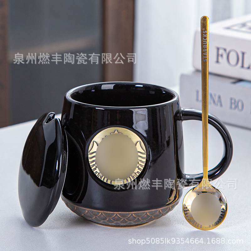 一件代发星巴系列杯子风复古创意铜牌浮雕个性马克杯带盖勺咖啡杯