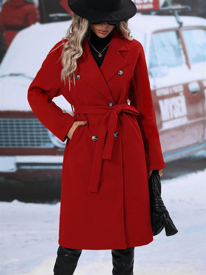 2025欧美外贸呢子大衣女 纯色翻领加厚双排扣加长系带外套