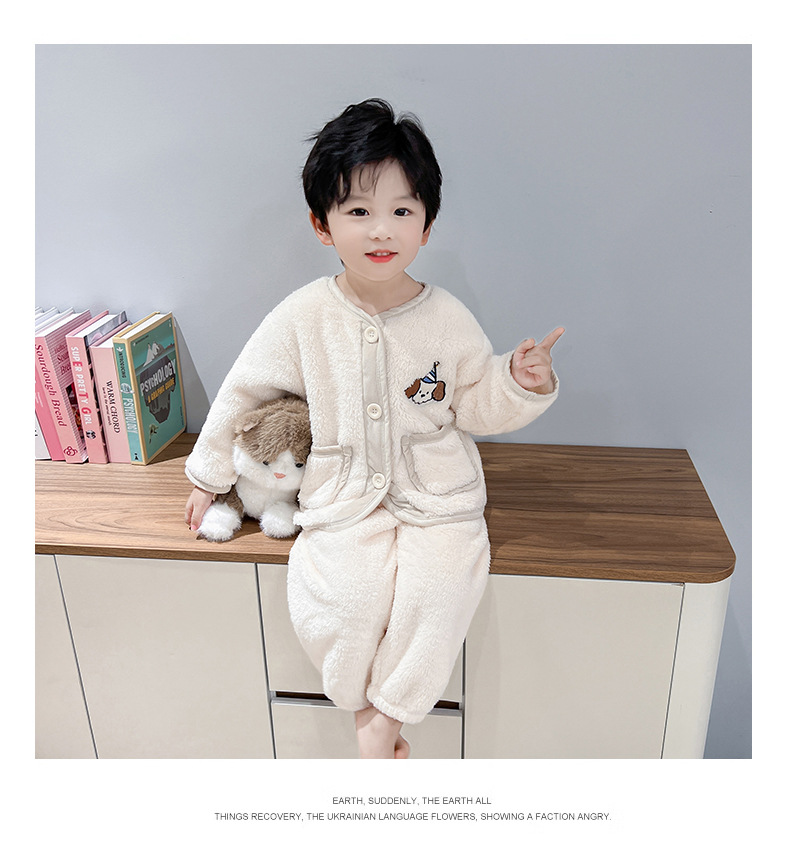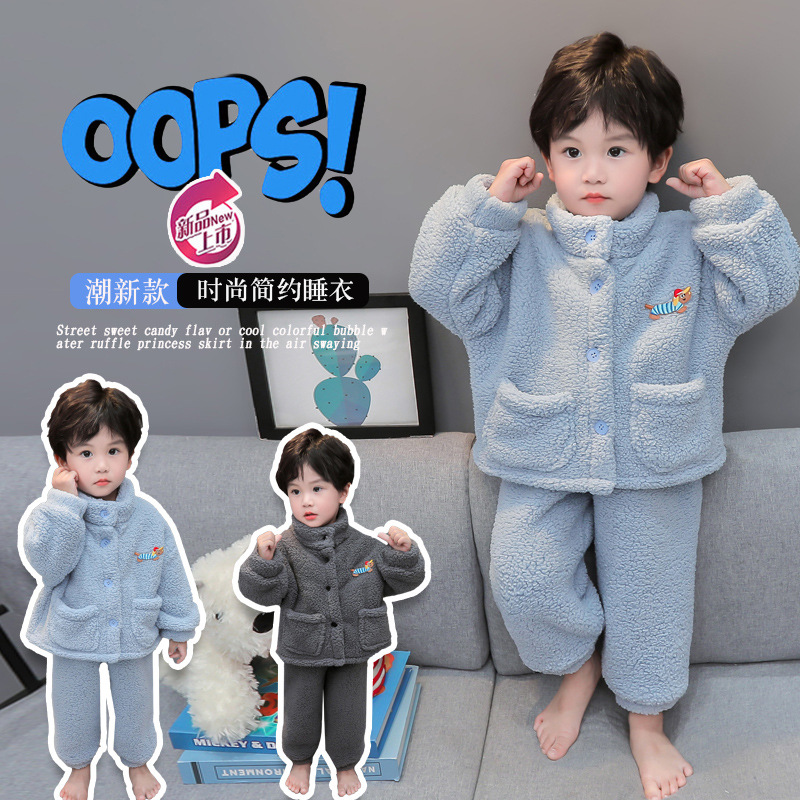 儿童珊瑚绒睡衣男童秋冬加厚款男孩宝宝法兰绒家居服卡通开衫套装