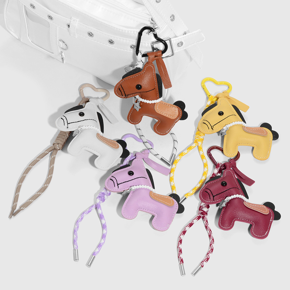 新款miu系风可爱复古时尚棕色皮革小马仿珍珠爱心DIY钥匙扣包挂件