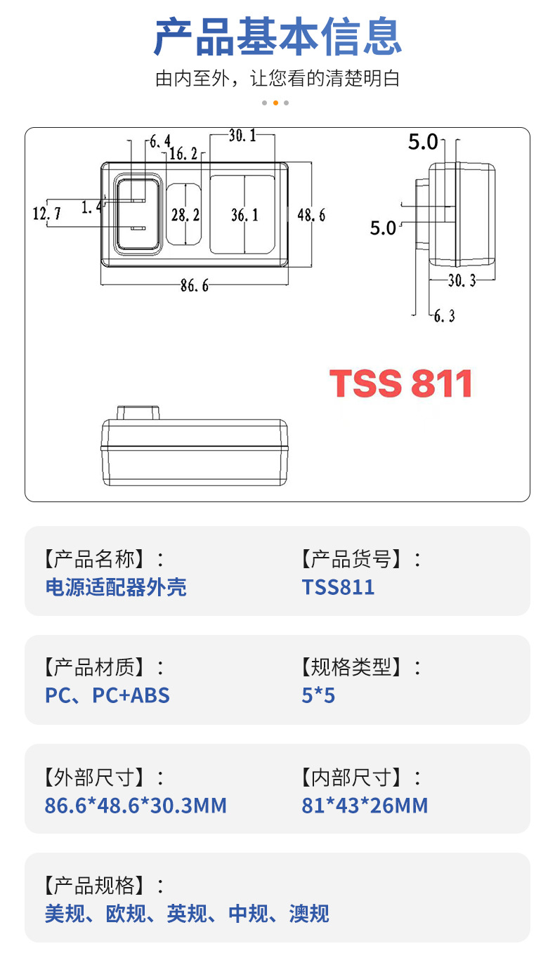 厂家供应TSS811 24W36W方龟207壳/2A3A插墙式电源适配器外壳批发
