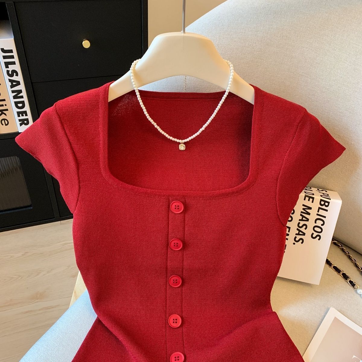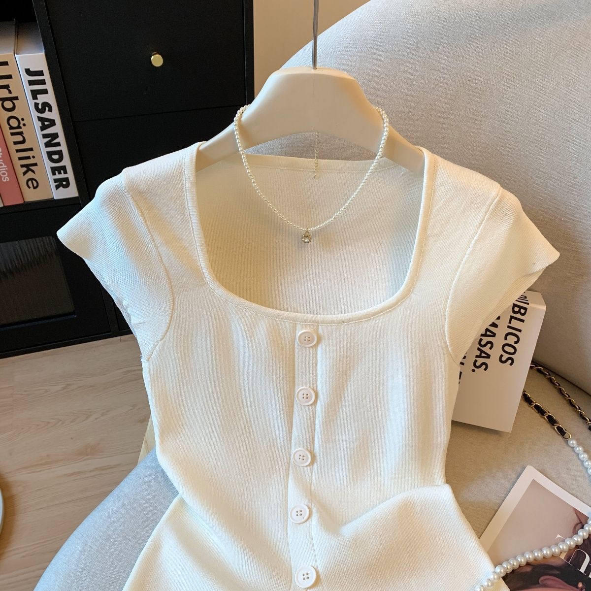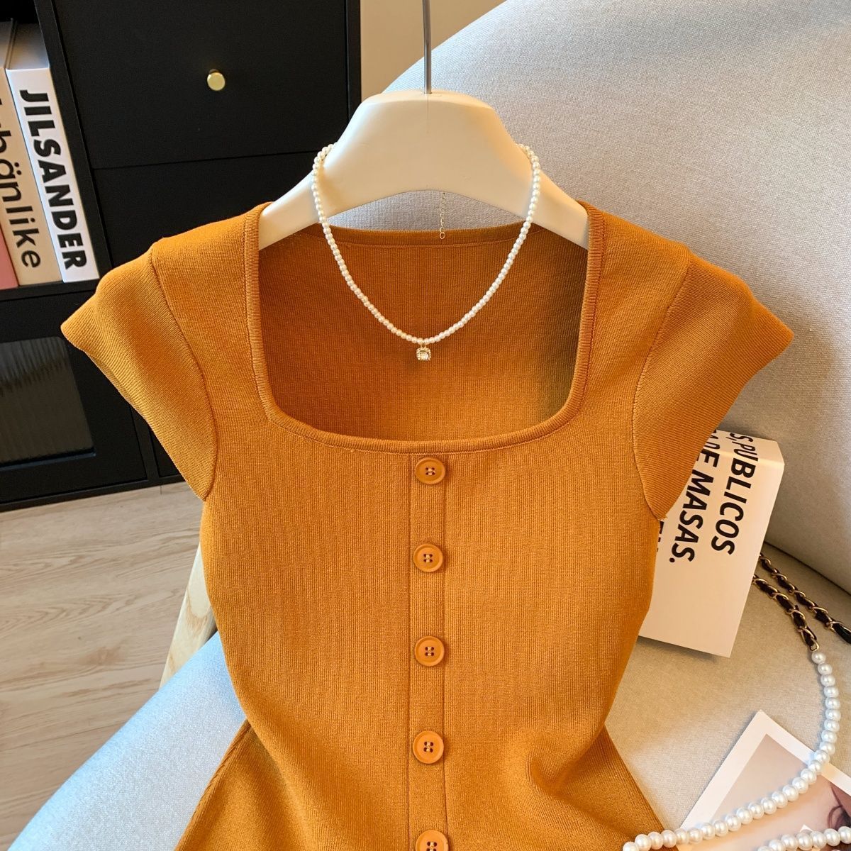 2025 新しい夏のファッショナブルなスリムで多用途なトップス、女性用のショルダースクエアカラーシングルブレストプルオーバー半袖セーター