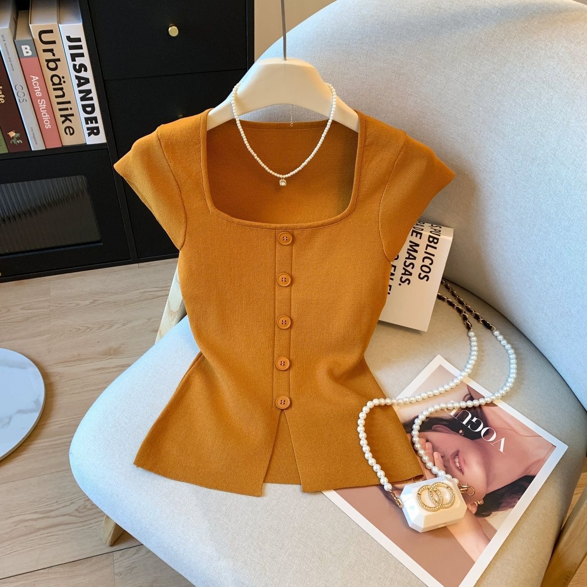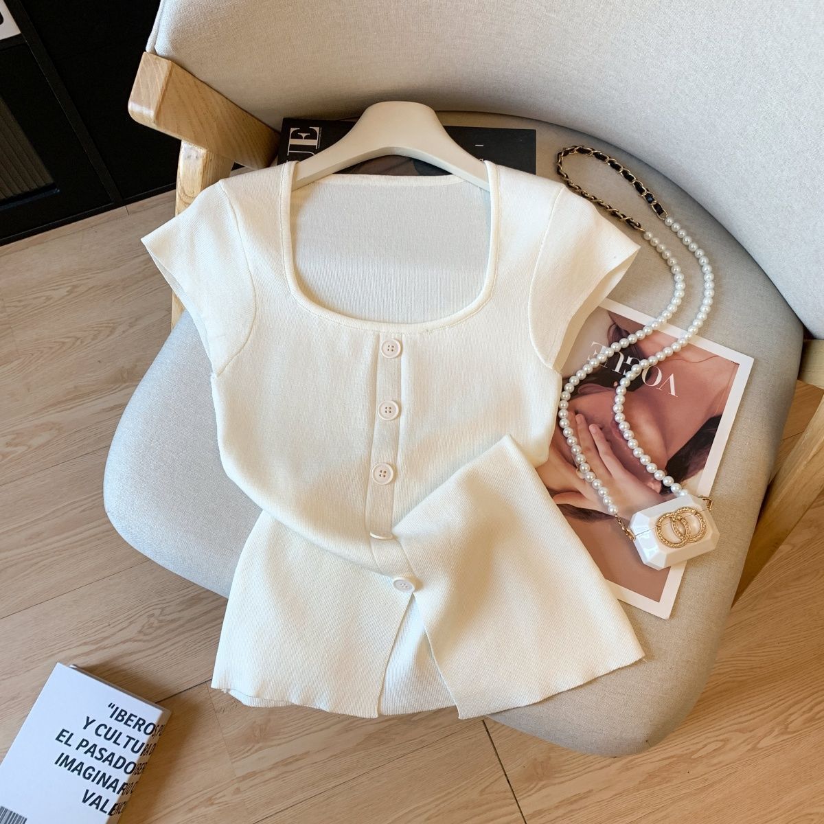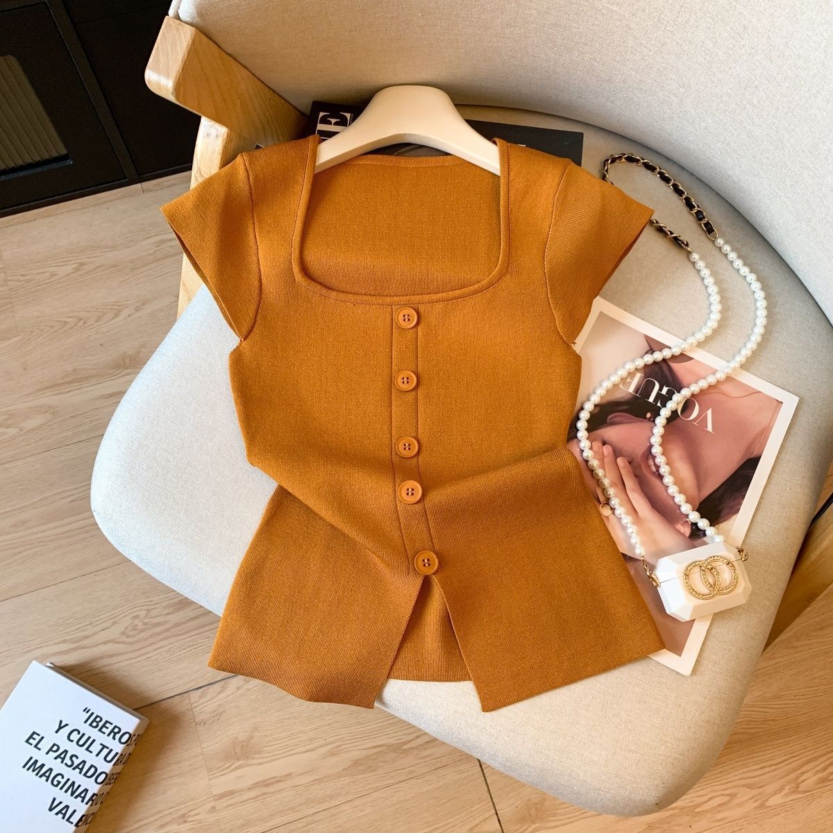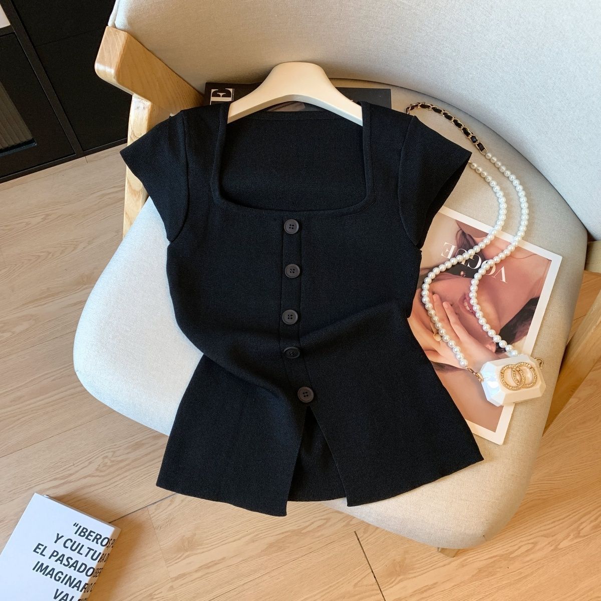 小香风方领正肩冰丝针织短袖T恤女装夏高级感修身开叉别致小上衣