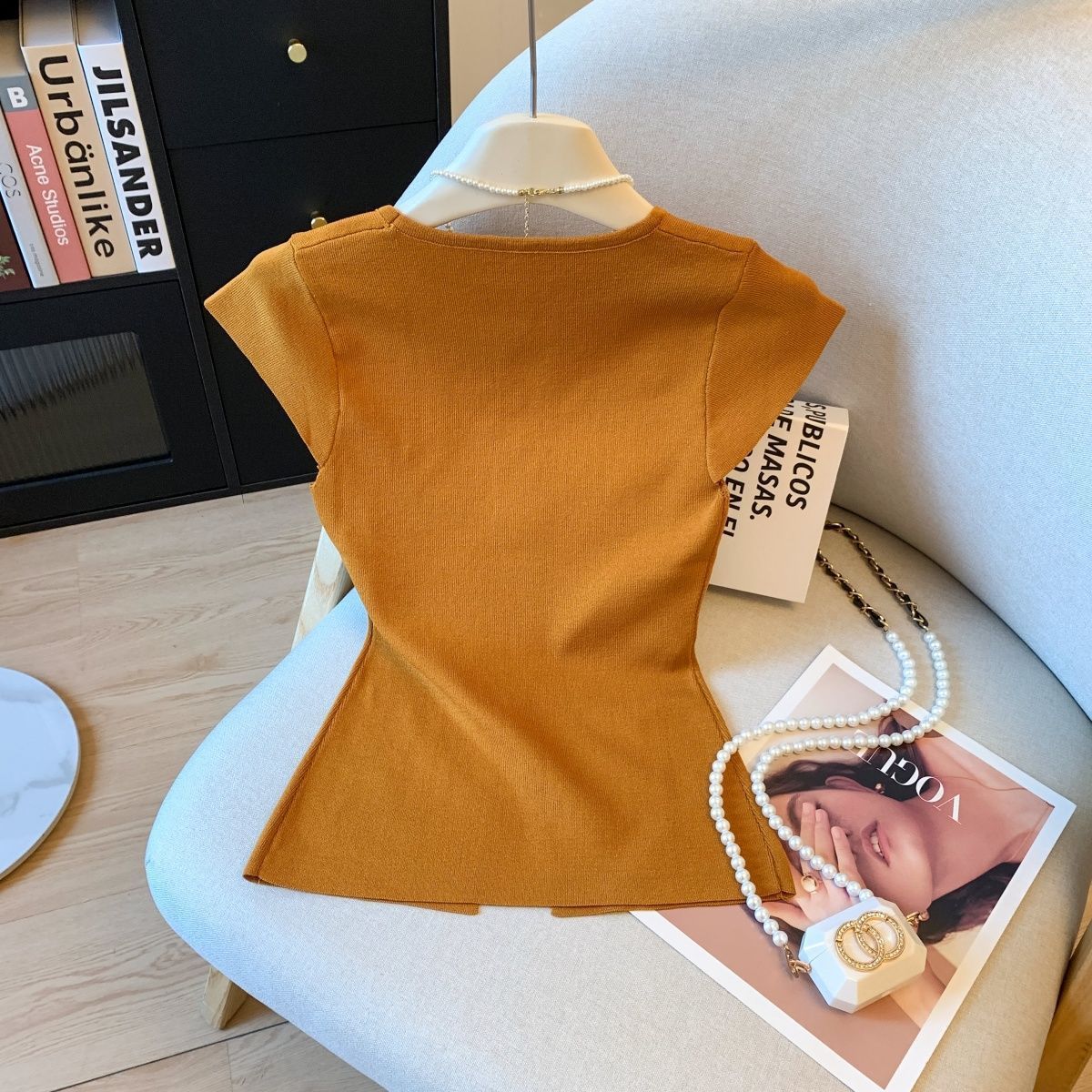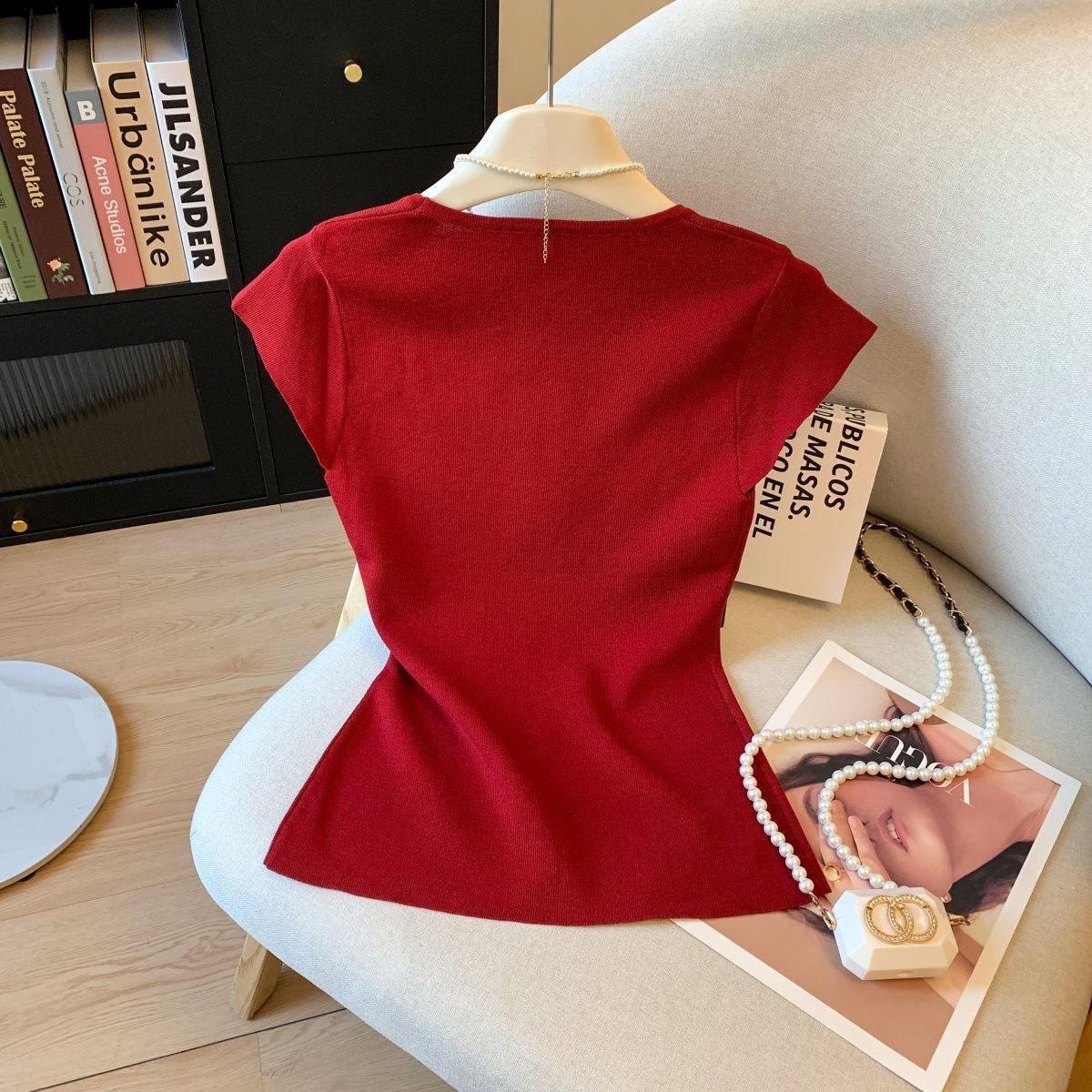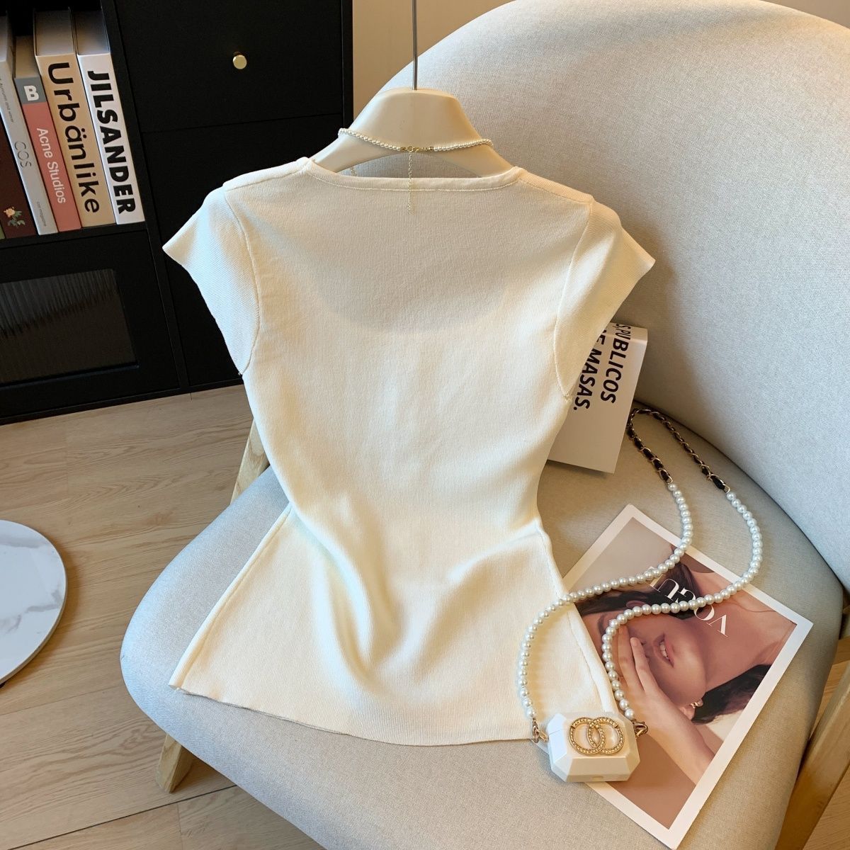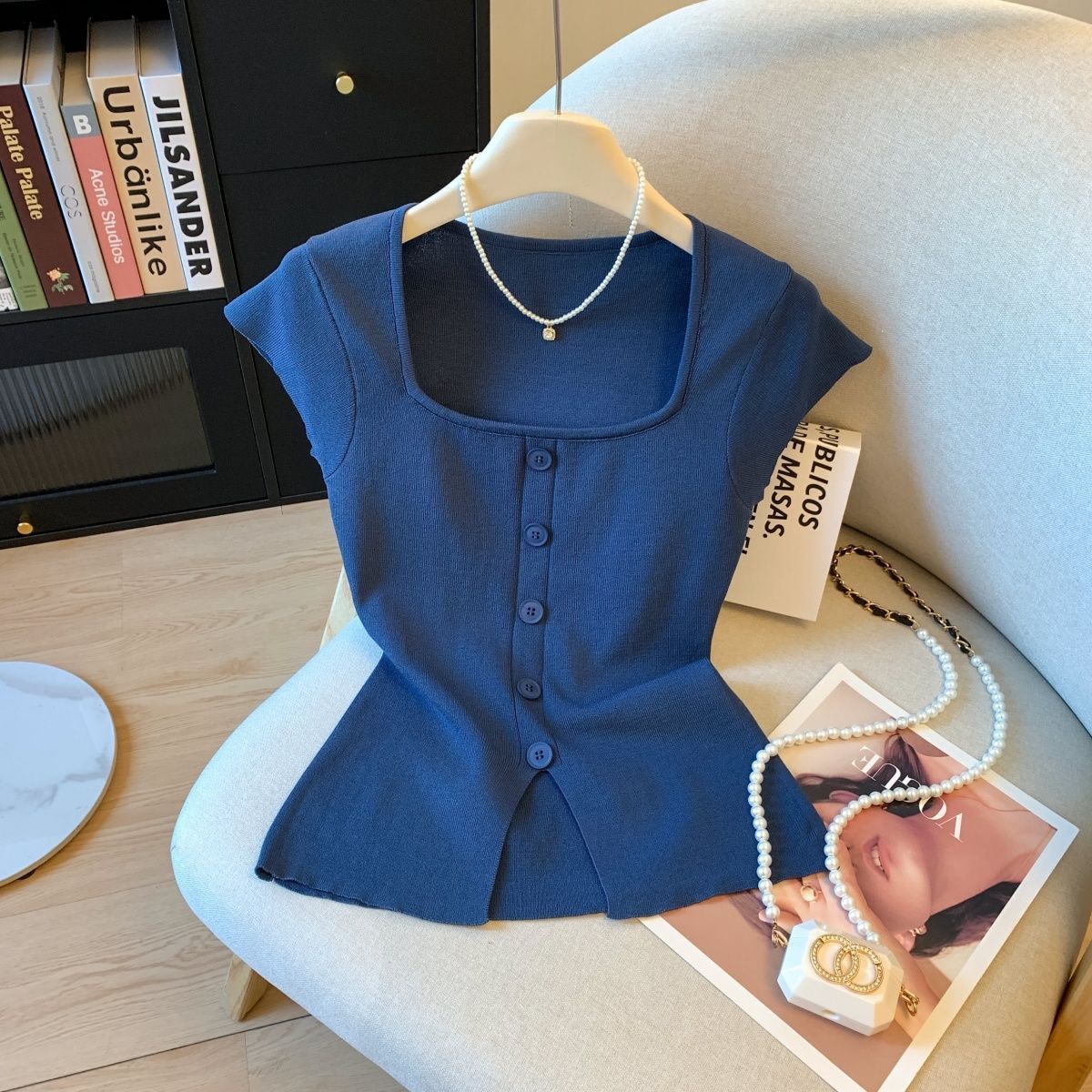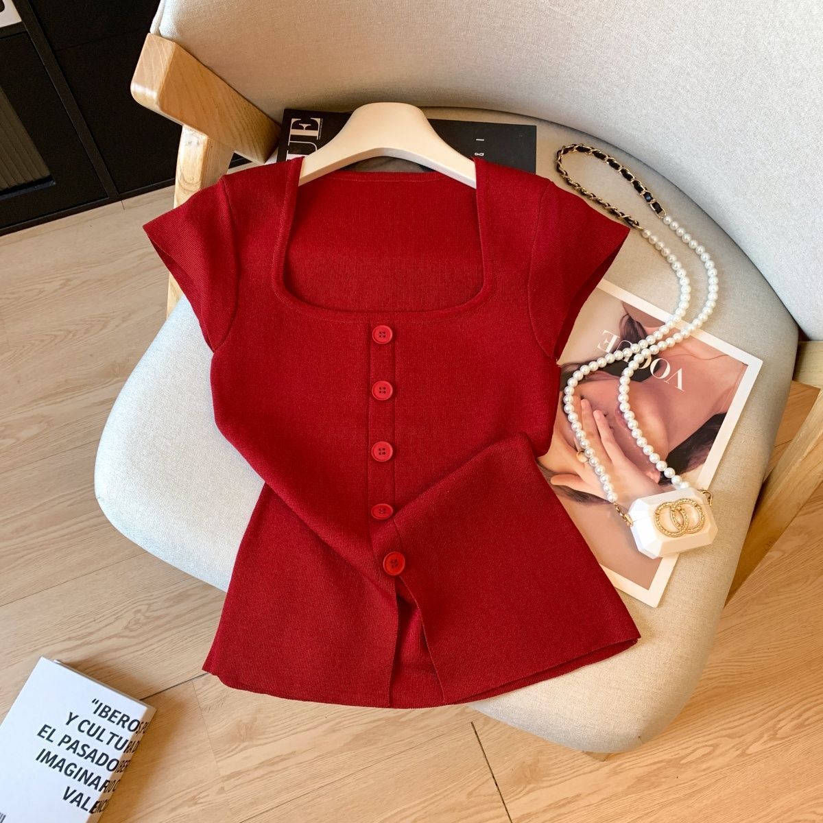 小香风方领正肩冰丝针织短袖T恤女装夏高级感修身开叉别致小上衣