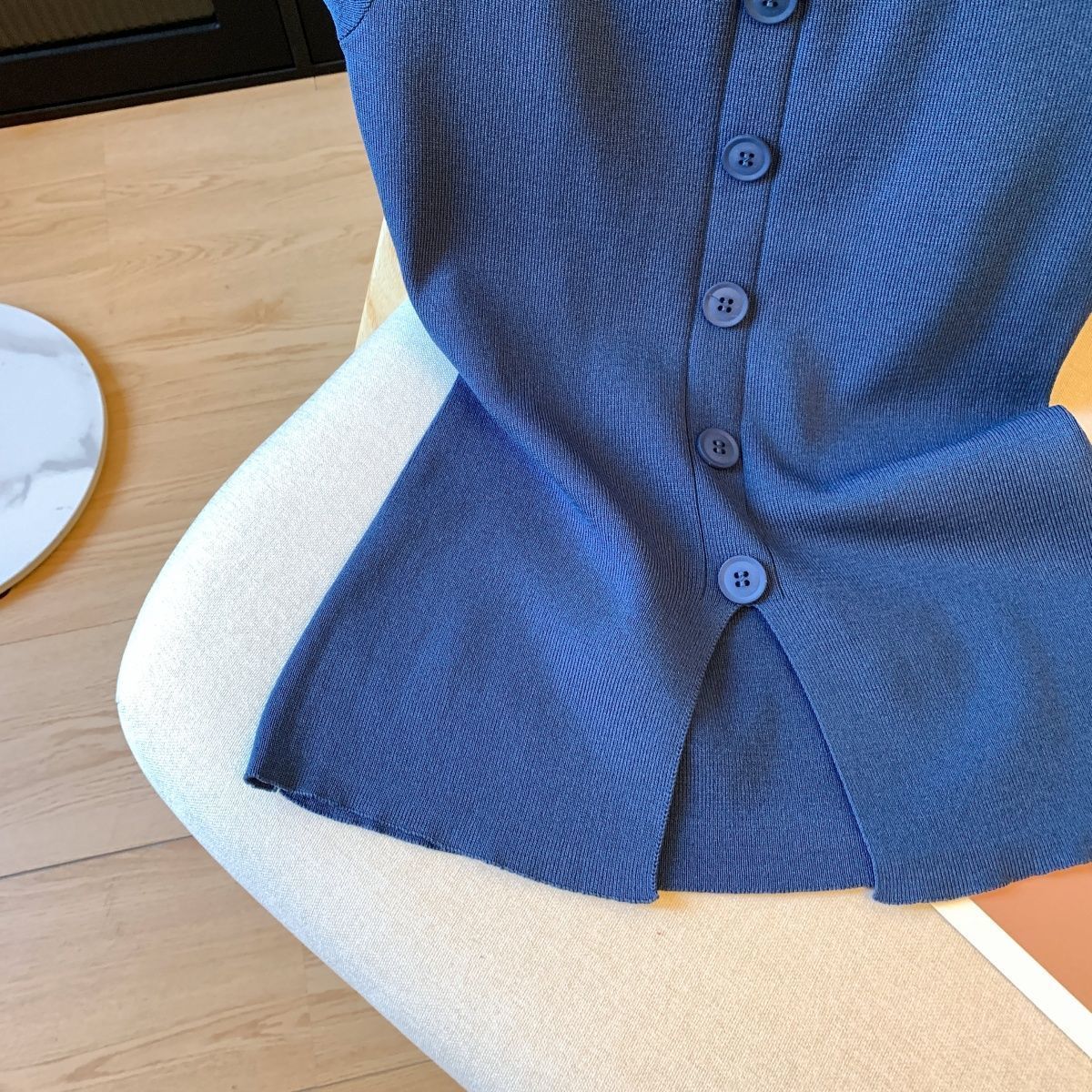 新款韩版小飞袖设计感方领套头甜美气质修身显瘦下摆开叉针织衫