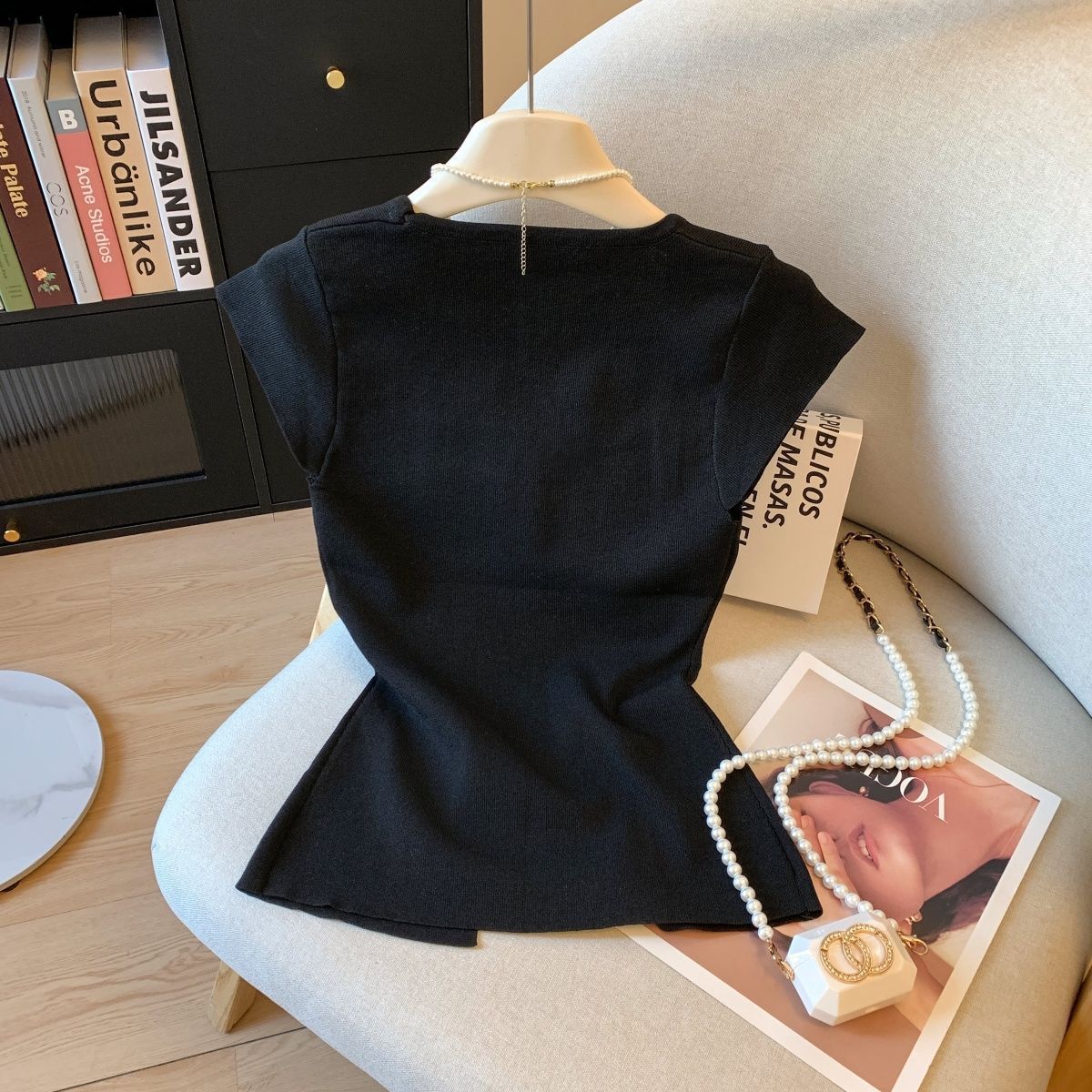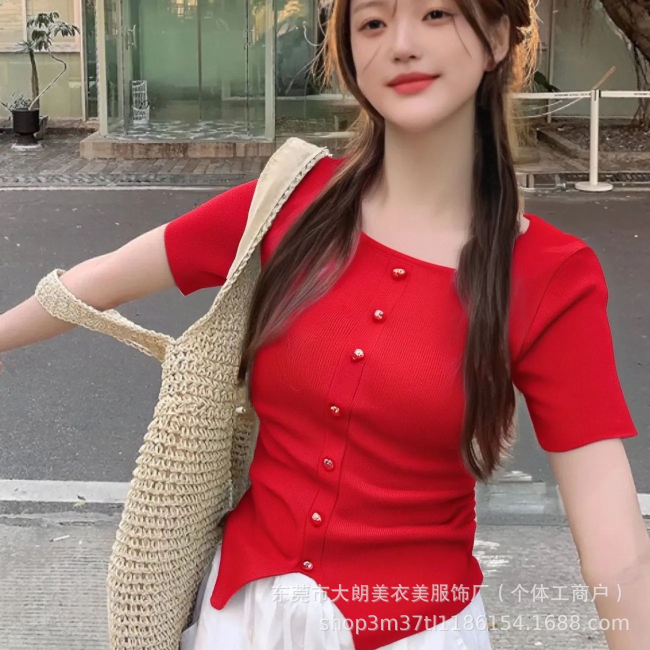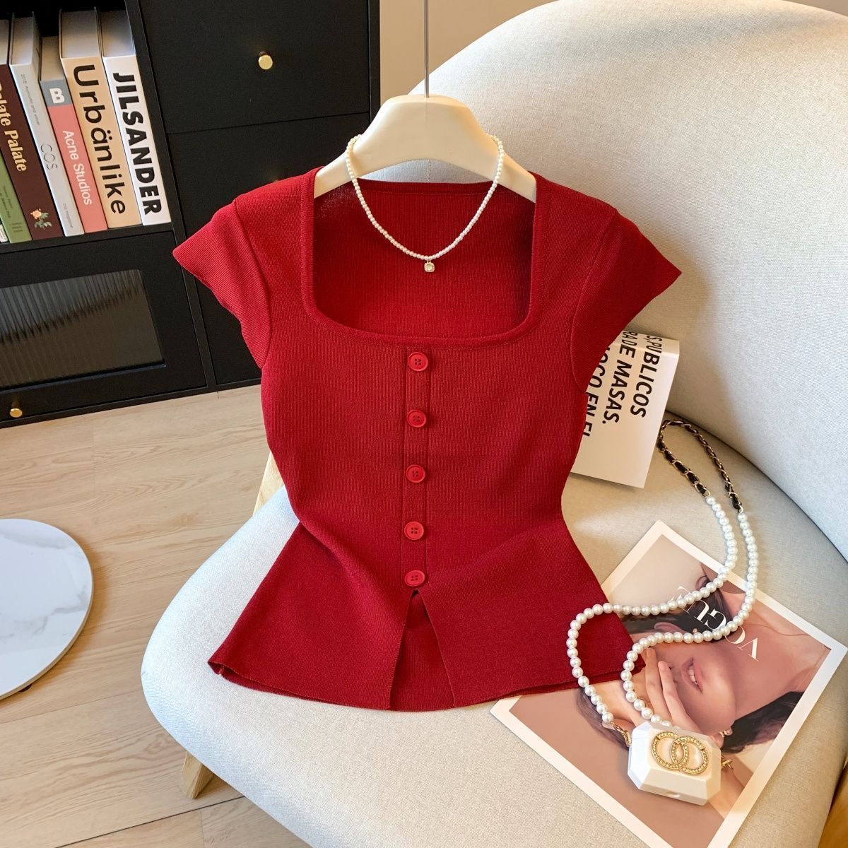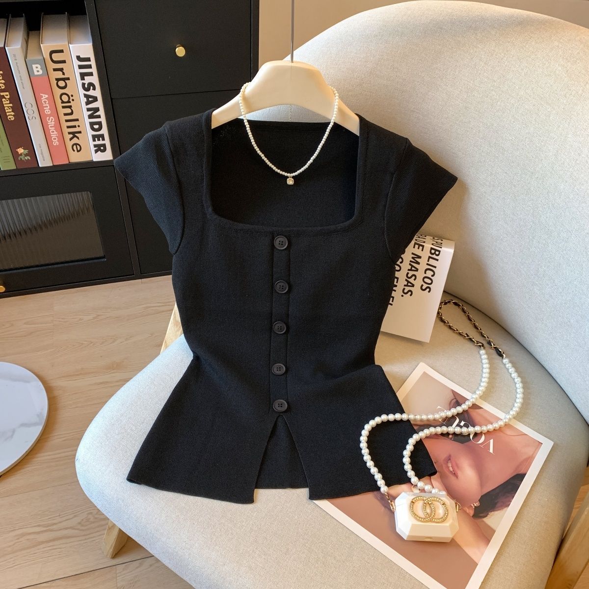 方领短袖短款针织衫修身夏季2025新款显瘦开叉收腰上衣简约外穿