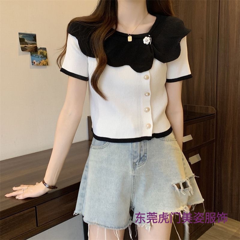 夏季新款薄款撞色花边领温柔短袖针织衫女修身显瘦短款上衣女小衫