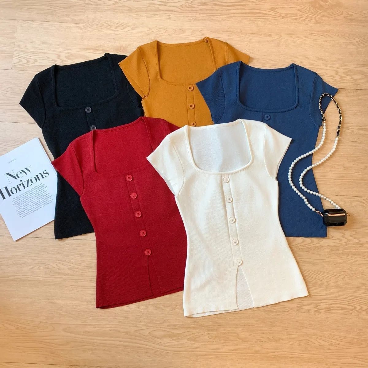 新款纯色韩版短袖T恤设计感方领套头气质修身显瘦针织打底衫上衣