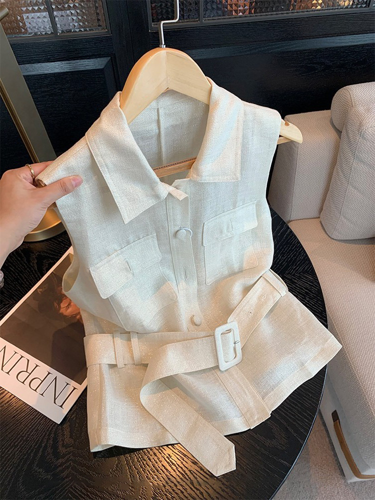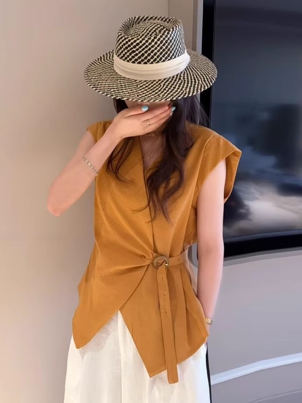 老钱风无袖恤女新款衬衣高级感小飞袖掐腰独特别致棉麻上衣