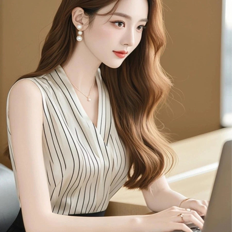 フレンチライトマチュアカラーストライプベストシフォンシャツレディースデザインニッチ夏ユニークでシックなノースリーブトップ