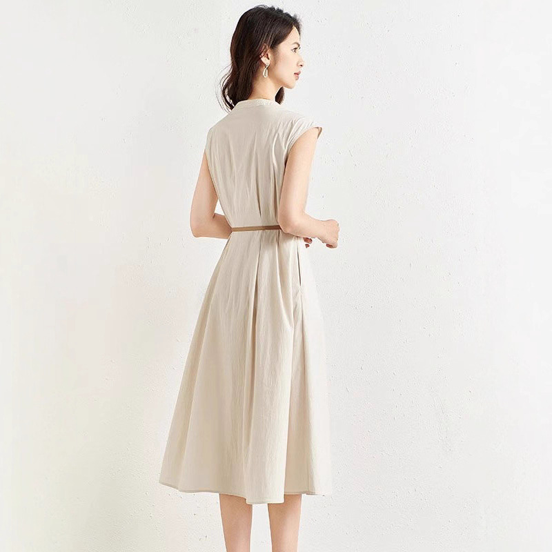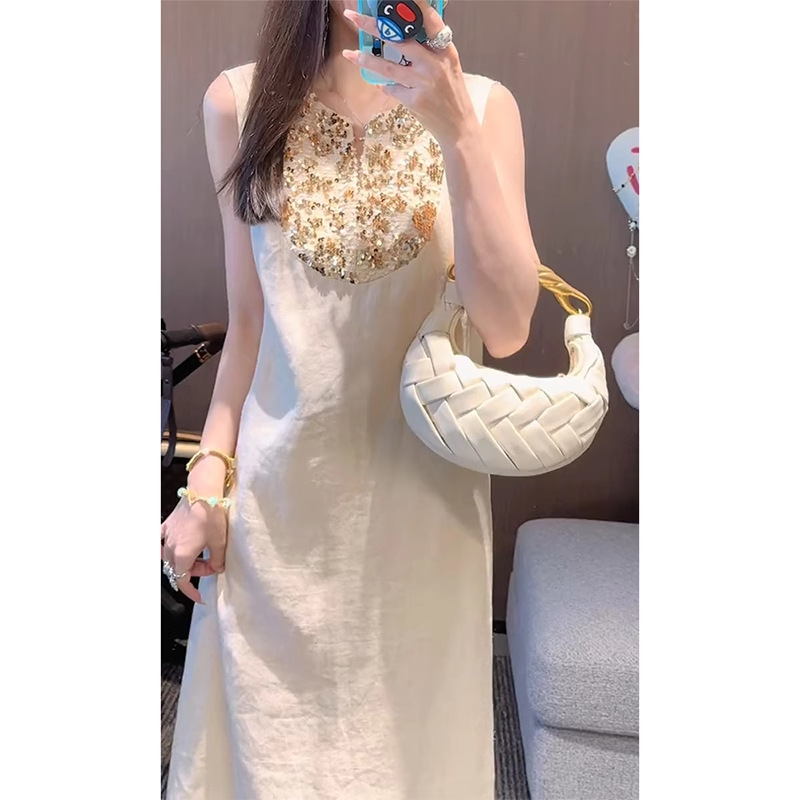 アウトレットクリアランスフレンチベージュノースリーブベストリネンハイエンドステッチストレートカジュアルノースリーブドレス女性用