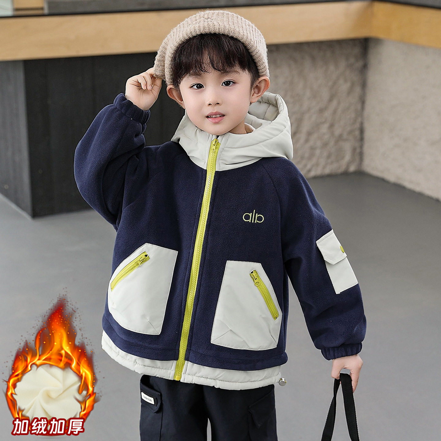 奥利绒男童加绒外套秋冬潮牌小男孩冬装儿童衣服宝宝连帽加厚夹克