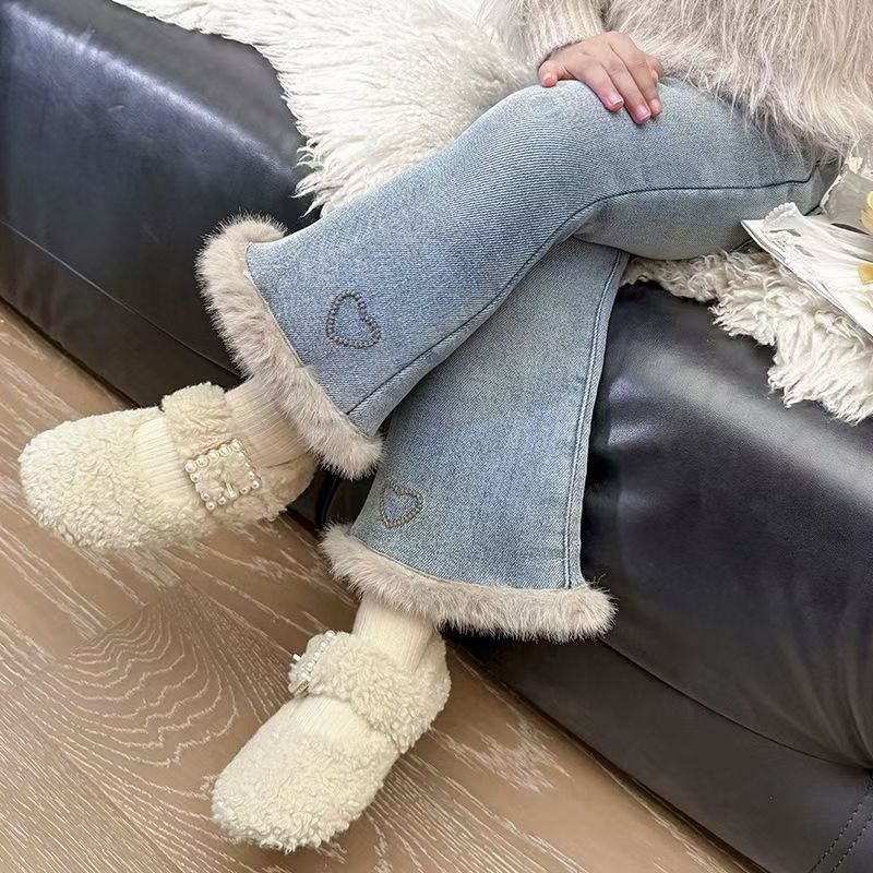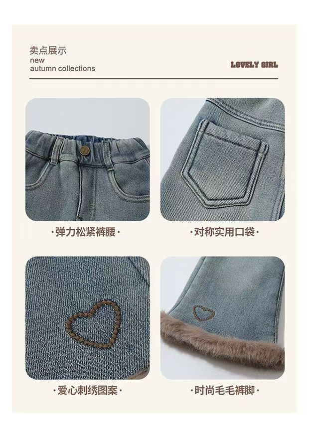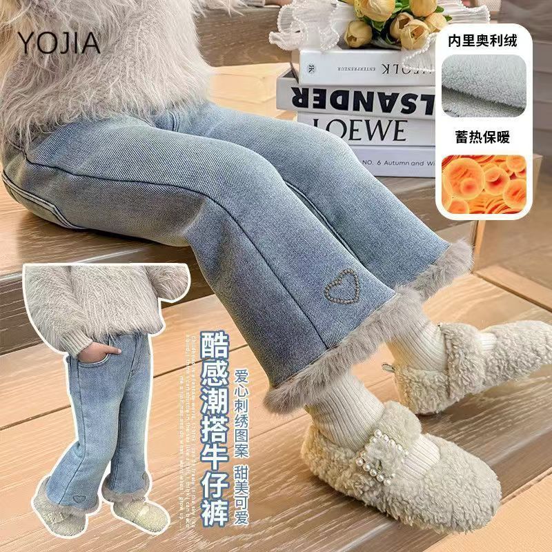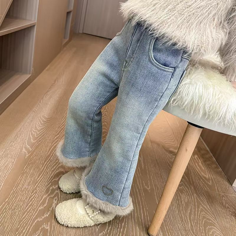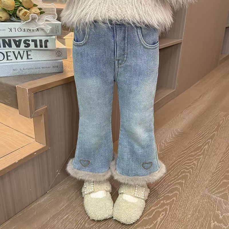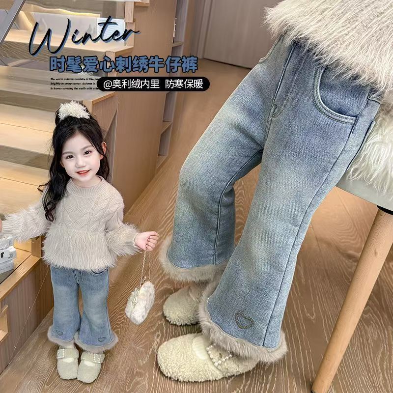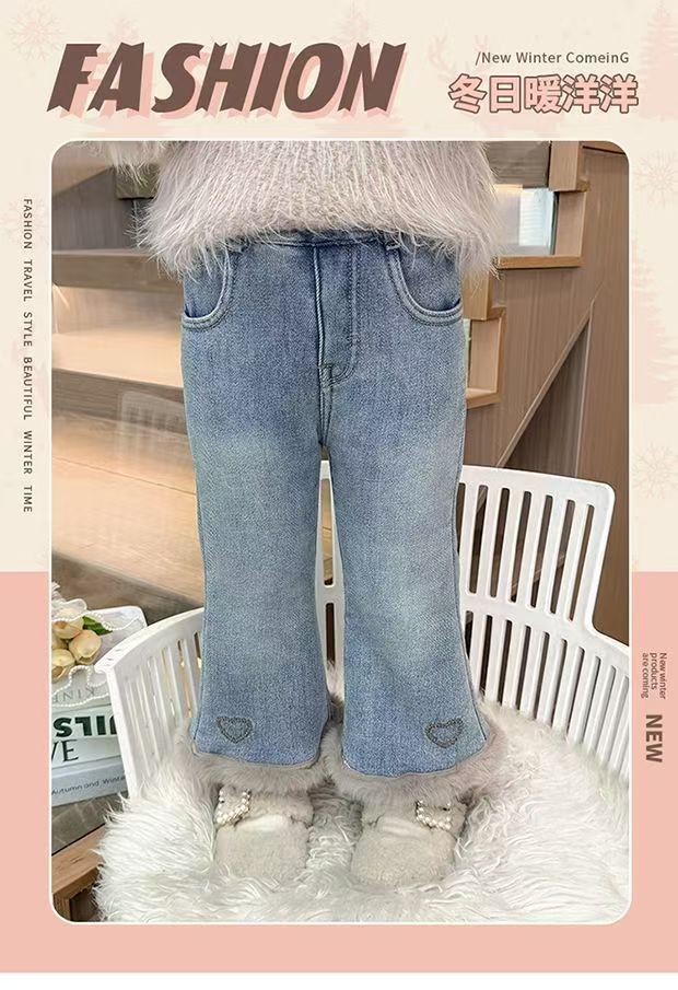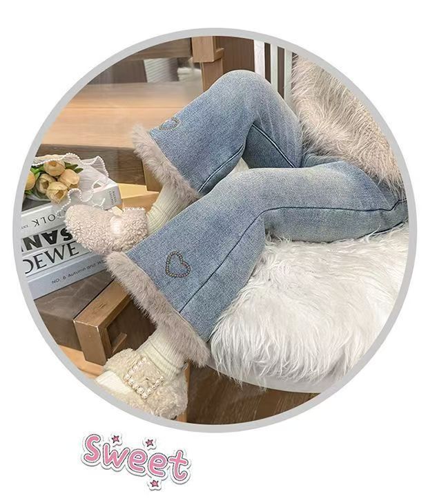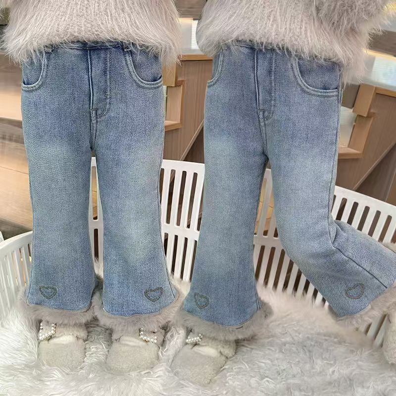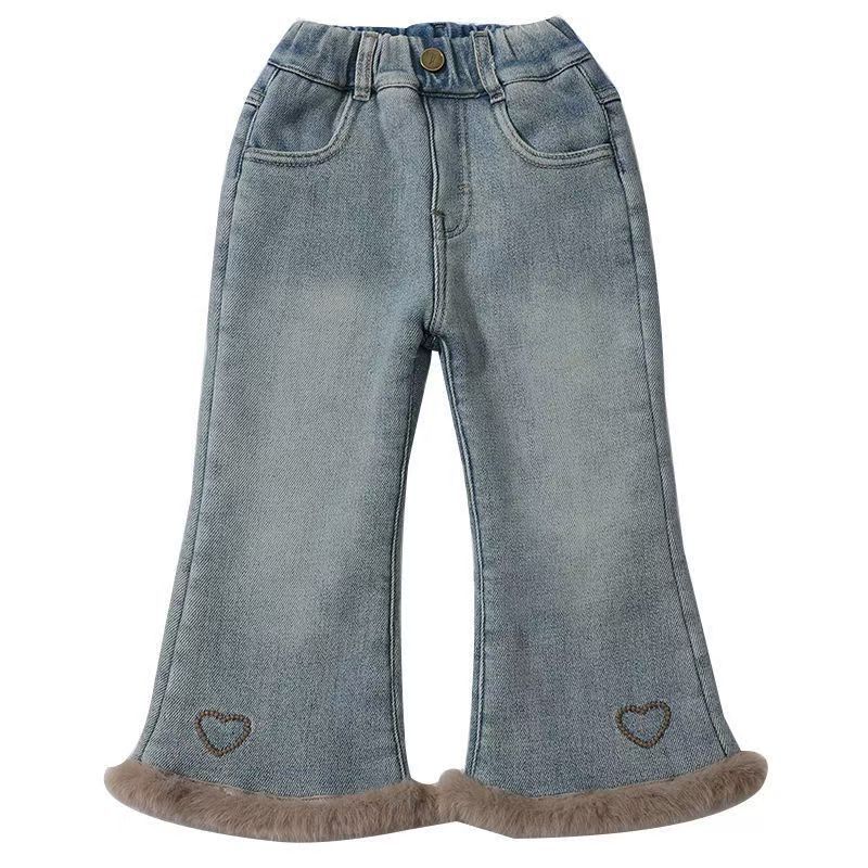女童加绒牛仔裤新款冬装女宝宝洋气一体绒爱心喇叭裤小女孩长裤子