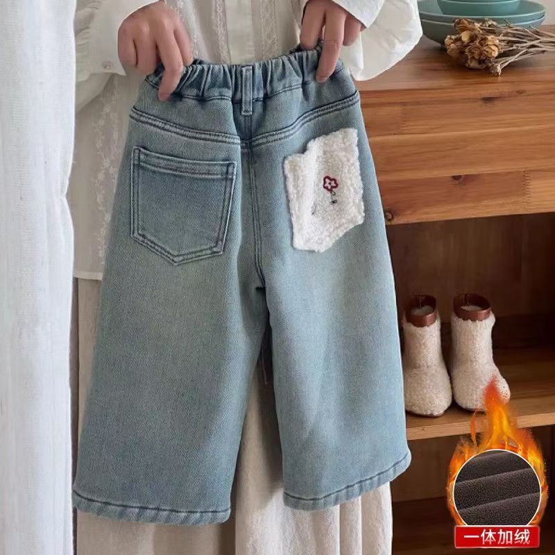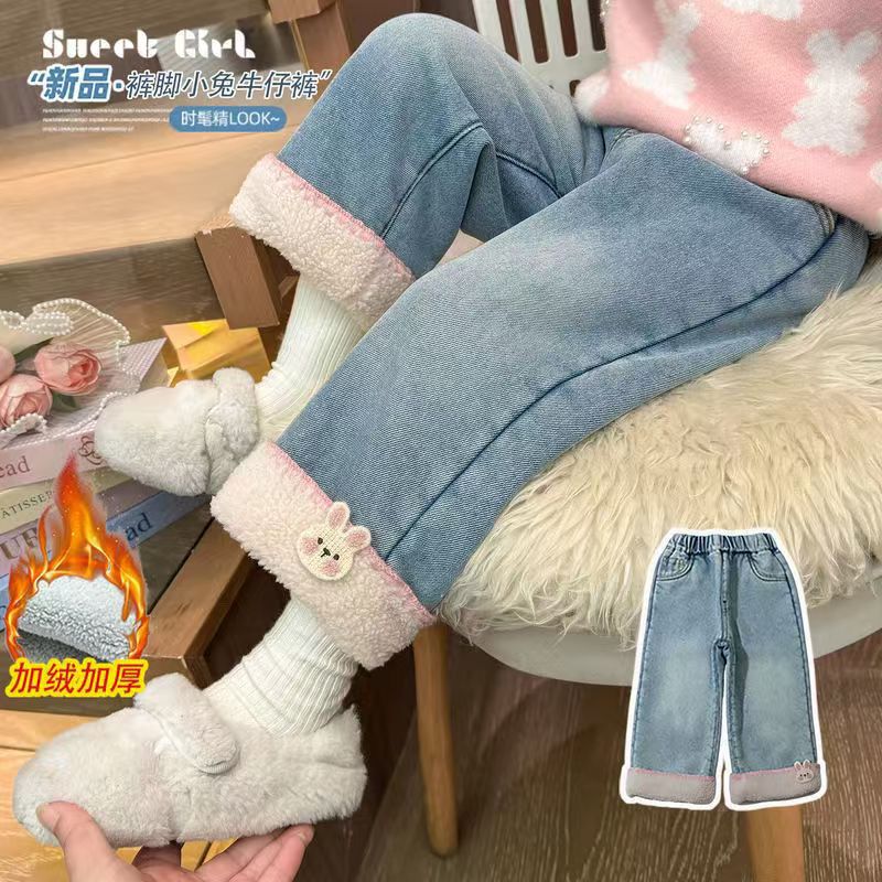 子供服女の子ベルベットジーンズ 25 秋と冬かわいいベビーパンツ漫画ラムウールスプライシング子供ストレートパンツ