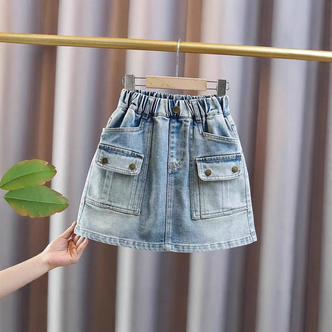韓国風ウォッシュ加工レトロデニムショートスカート2024夏万能ハイウエストスカートポケット付きワークウェア風スカート中大童向け