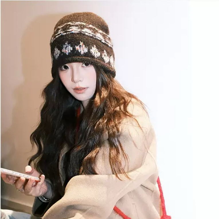 冰岛提花藏青卷边针织帽日系复古文艺小众包头保暖毛线帽冷帽女